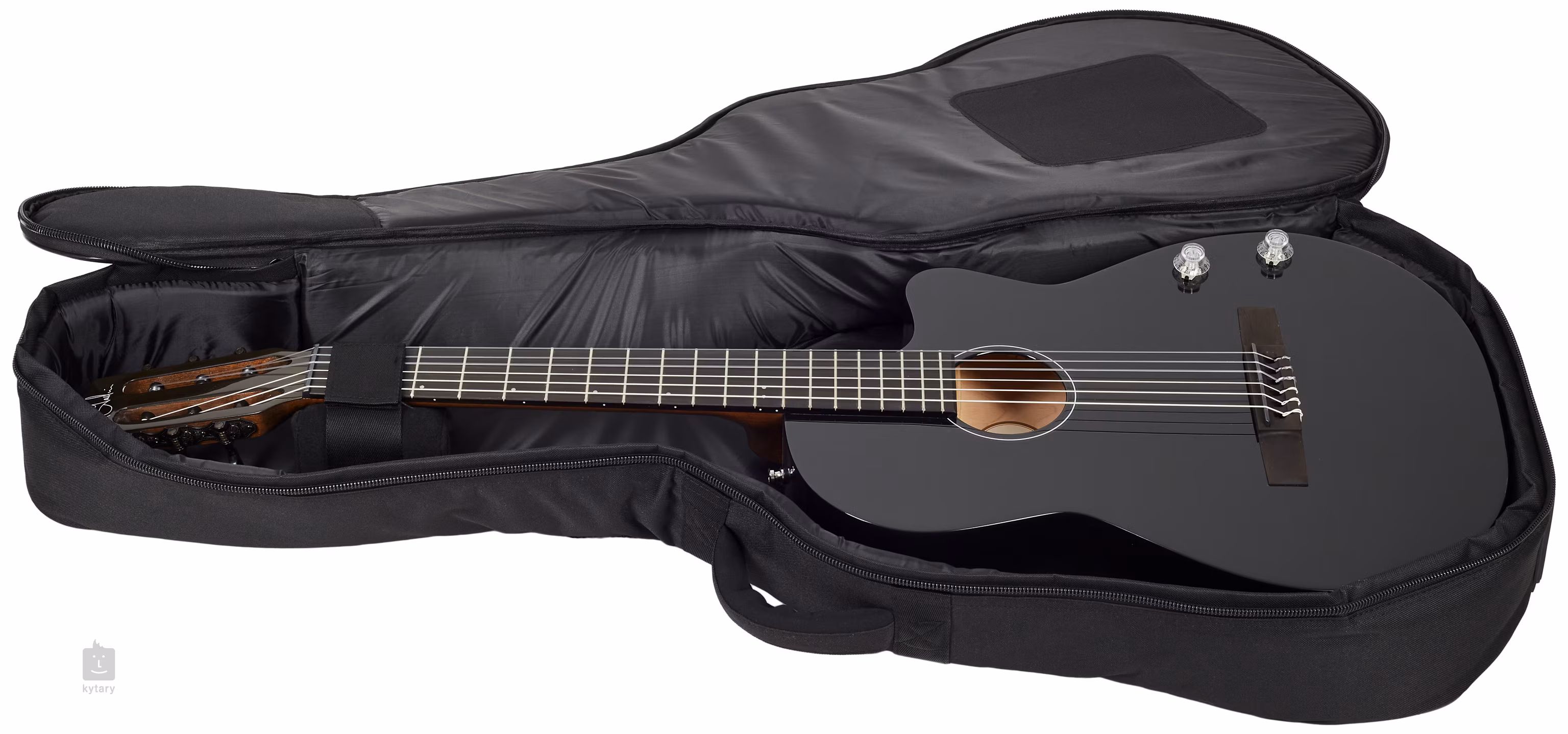 Die Arena Pro Ltd CW Onyx Black EQ mit Tasche ist eine semi-massive Gitarre mit einer massiven Zederndecke und einem Boden und Zargen aus Sperrholz kanadischer Massivkirsche. Auf den Mahagoni-Hals ist ein Ebenholz-Griffbrett mit neunzehn Bünden geleimt. Eine tiefe, abgerundete Aussparung im unteren Teil des Korpus ermöglicht eine gute Anpassung an die Oberseite des Griffbretts.