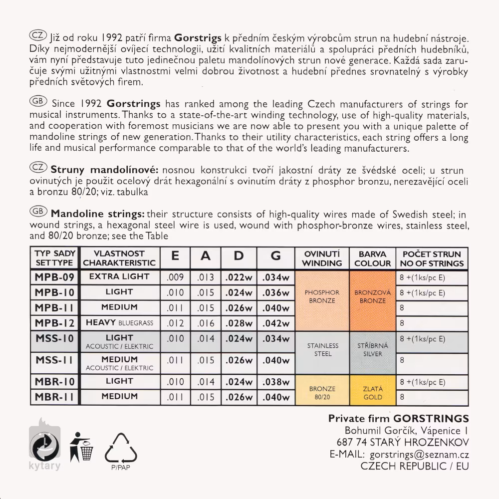 Die Mandolinensaiten des tschechischen Herstellers Gorstrings sind aus erstklassigen Materialien gefertigt und sind durch die Hände der besten tschechischen Handwerker gegangen. Sie basieren auf einem sechseckigen Kern aus hochwertigem schwedischem Stahl, der mit rostfreiem Stahl umwickelt ist - das verleiht den Saiten einen scharfen, klingenden Ton, der sie in jeder Situation hervorstechen lässt. Die Saiten sind mit einer Schlaufe zum Aufhängen am Saitenhaken versehen. Geben Sie Ihrem Instrument das Beste mit Gorstrings!