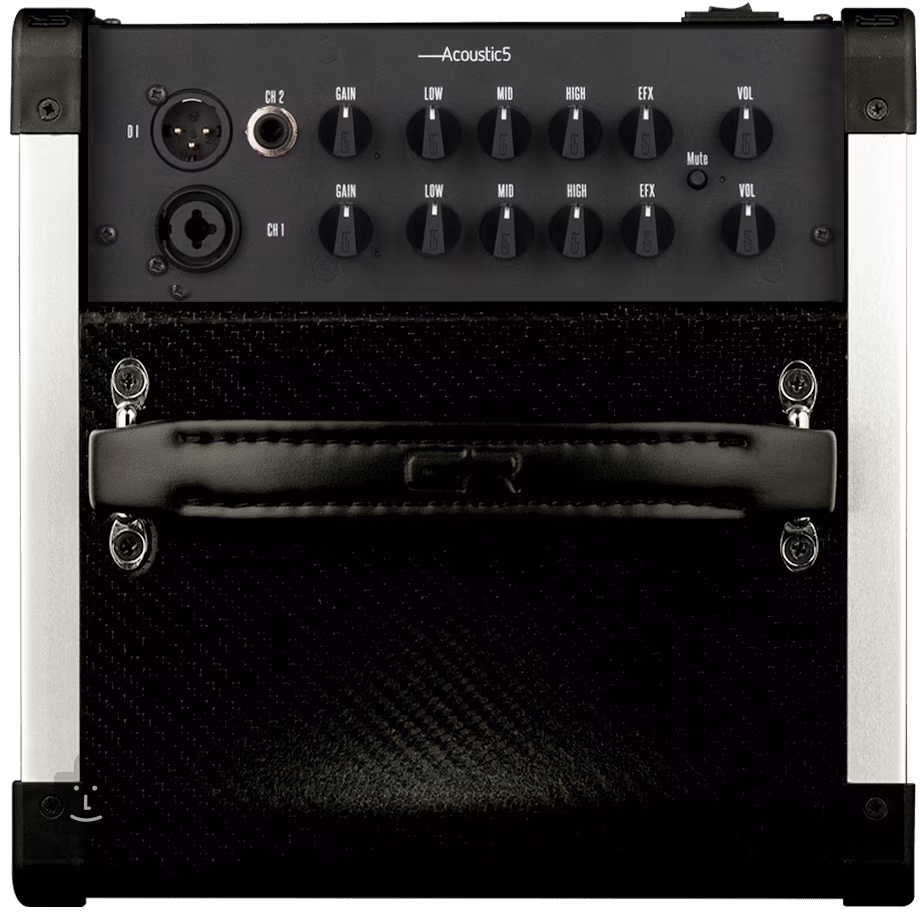 Der Combo verfügt über zwei Kanäle, die jeweils einen separaten Eingang bieten - Kanal 1 ist mit einem kombinierten XLR-/Klinkeneingang ausgestattet, während Kanal 2 nur einen Instrumenteneingang für die 6,3-mm-Klinkenbuchse bietet. Jeder Kanal verfügt über einen separaten Satz von Reglern, darunter Gain, einen Dreiband-EQ Low, Mid, High, einen EFX-Effektregler und einen Standard-Lautstärkeregler. Außerdem gibt es eine Mute-Taste, mit der das Signal des Verstärkers stummgeschaltet werden kann.