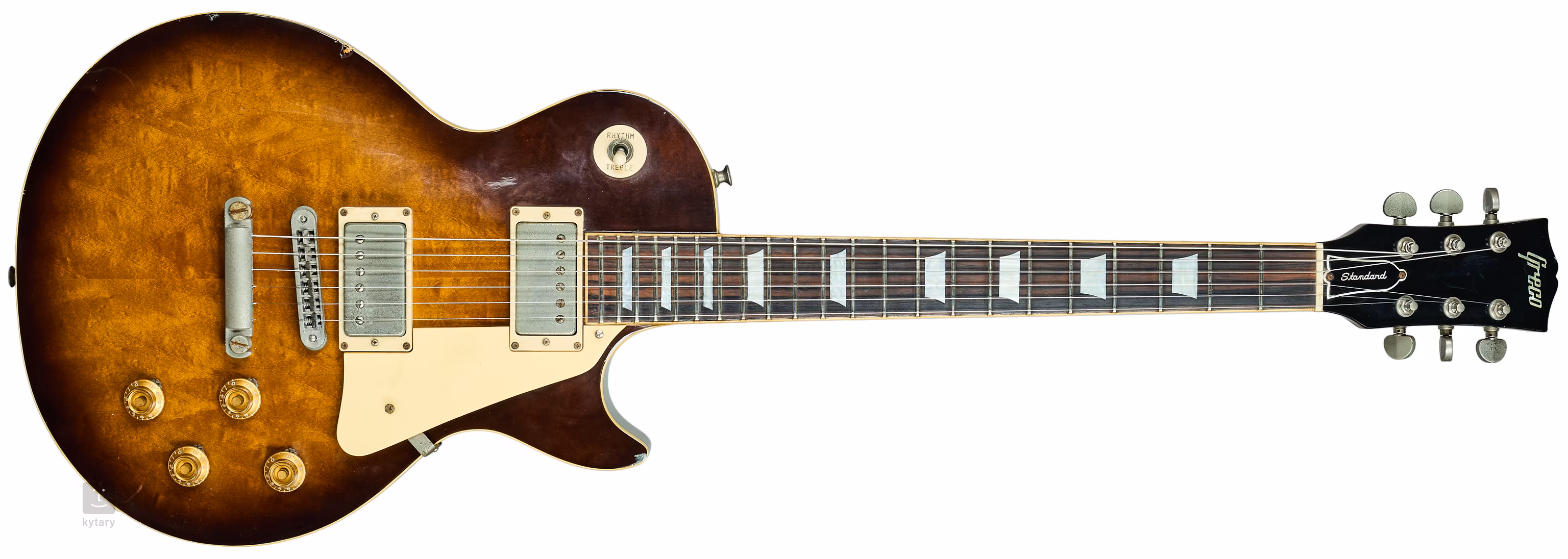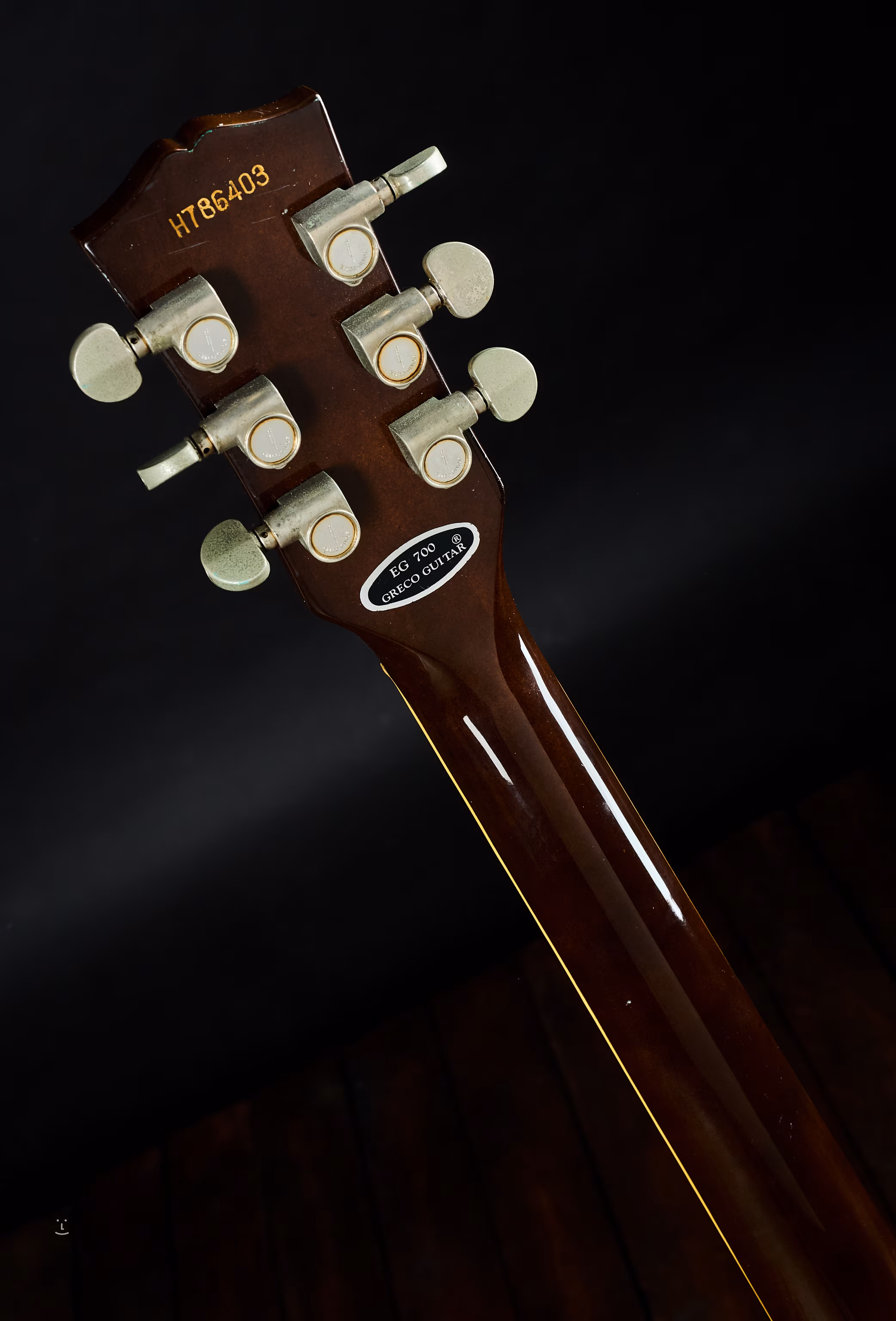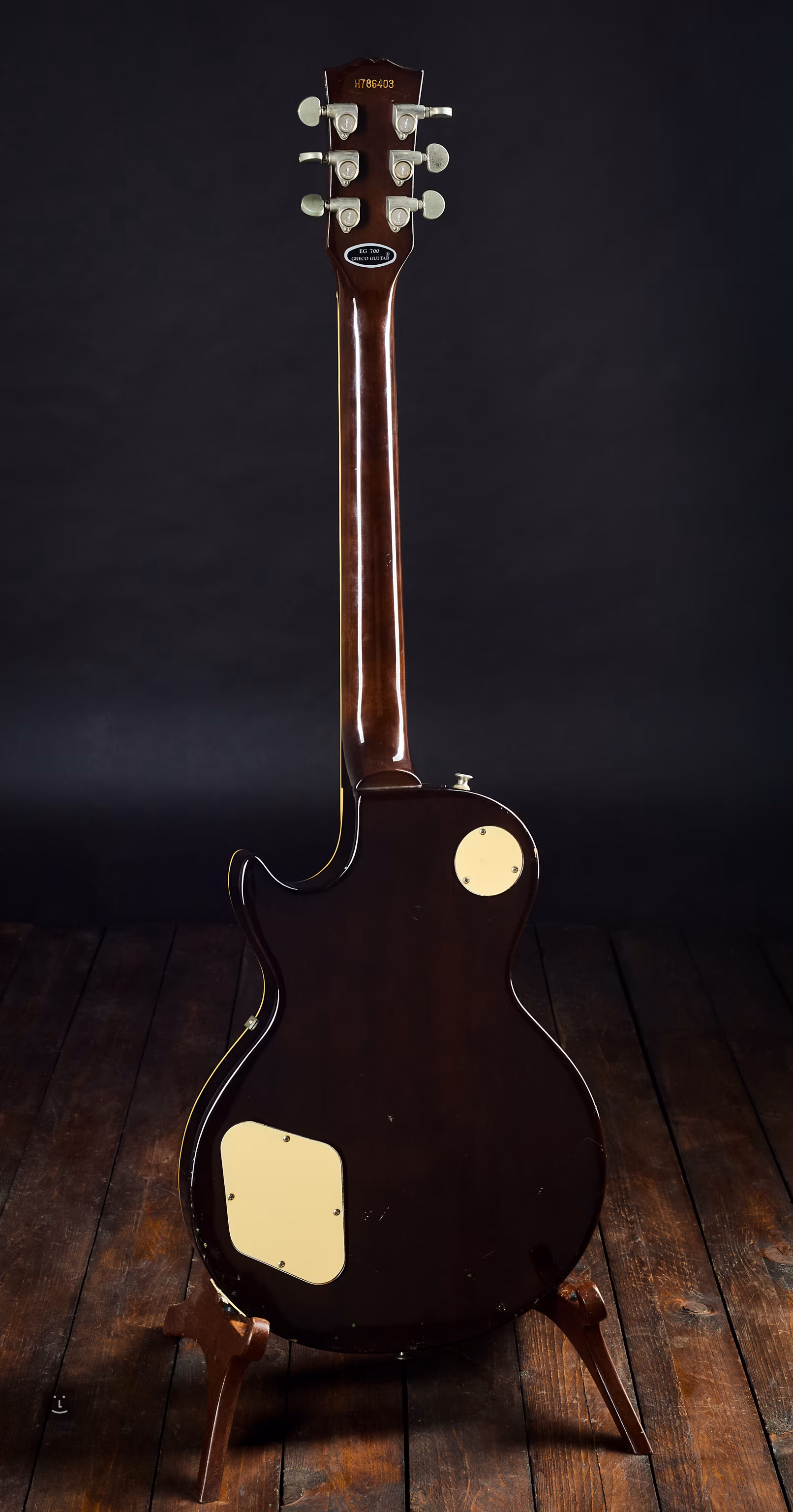 Korpus: Mahagoni mit Ahorndecke; Hals: Ahorn; Griffbrett: Palisander. Original Tonabnehmer, Greco U-2000 Humbucker.