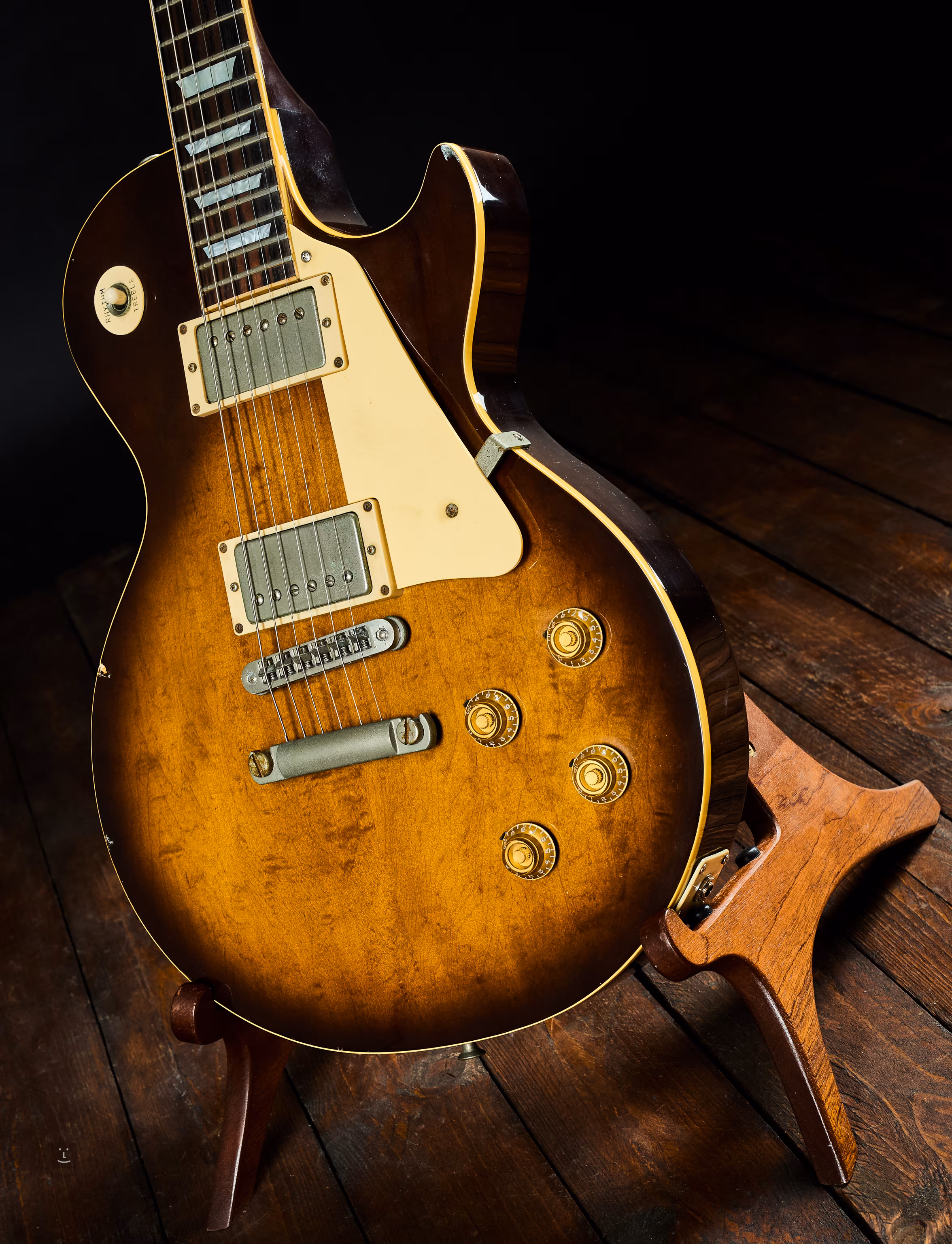 Alles an der Gitarre sieht original aus; die Bünde sind leicht gequetscht, aber noch nicht zu sehr, und es ist kein Ersatz nötig; die Halsgurtrolle ist ein wenig zu weit gebohrt; es gibt eine größere Delle im Lack an der Oberkante des Korpus.