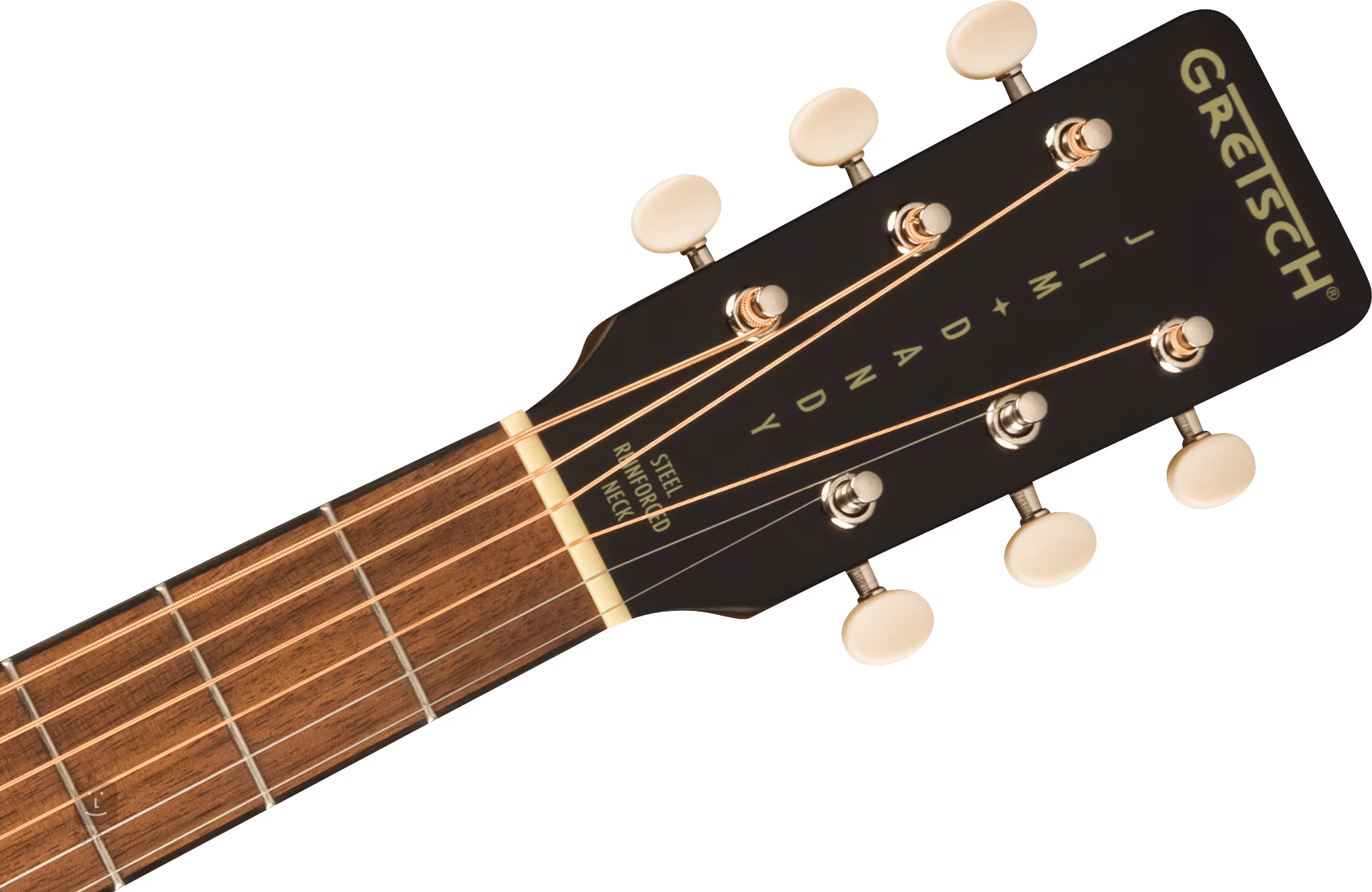 Ein Gretsch Deltoluxe Magnet-Tonabnehmer im Schallloch bietet die Möglichkeit der Klangverstärkung. Die Saiten werden über einen Nullbund und einen kompensierten Sattel aus synthetischem Knochen in offener Druckgussmechanik und einem Walnuss-Griffbrett befestigt. Der stilvolle Look der Gitarre wird durch ein Black Top-Finish auf der Decke, ein einlagiges Schlagbrett und eine Schildpattimitation am Rand sowie Nickel-Hardware unterstrichen.