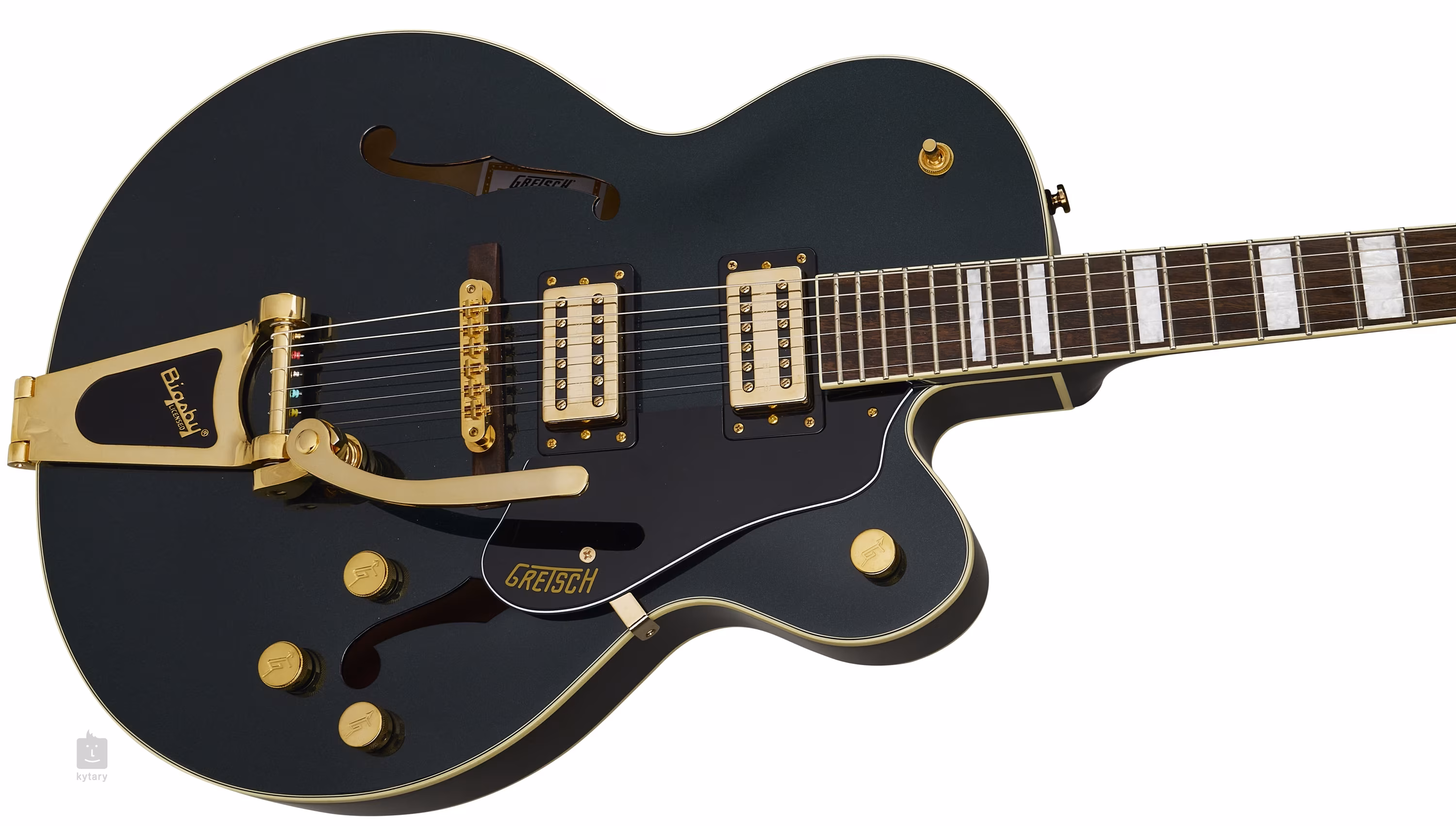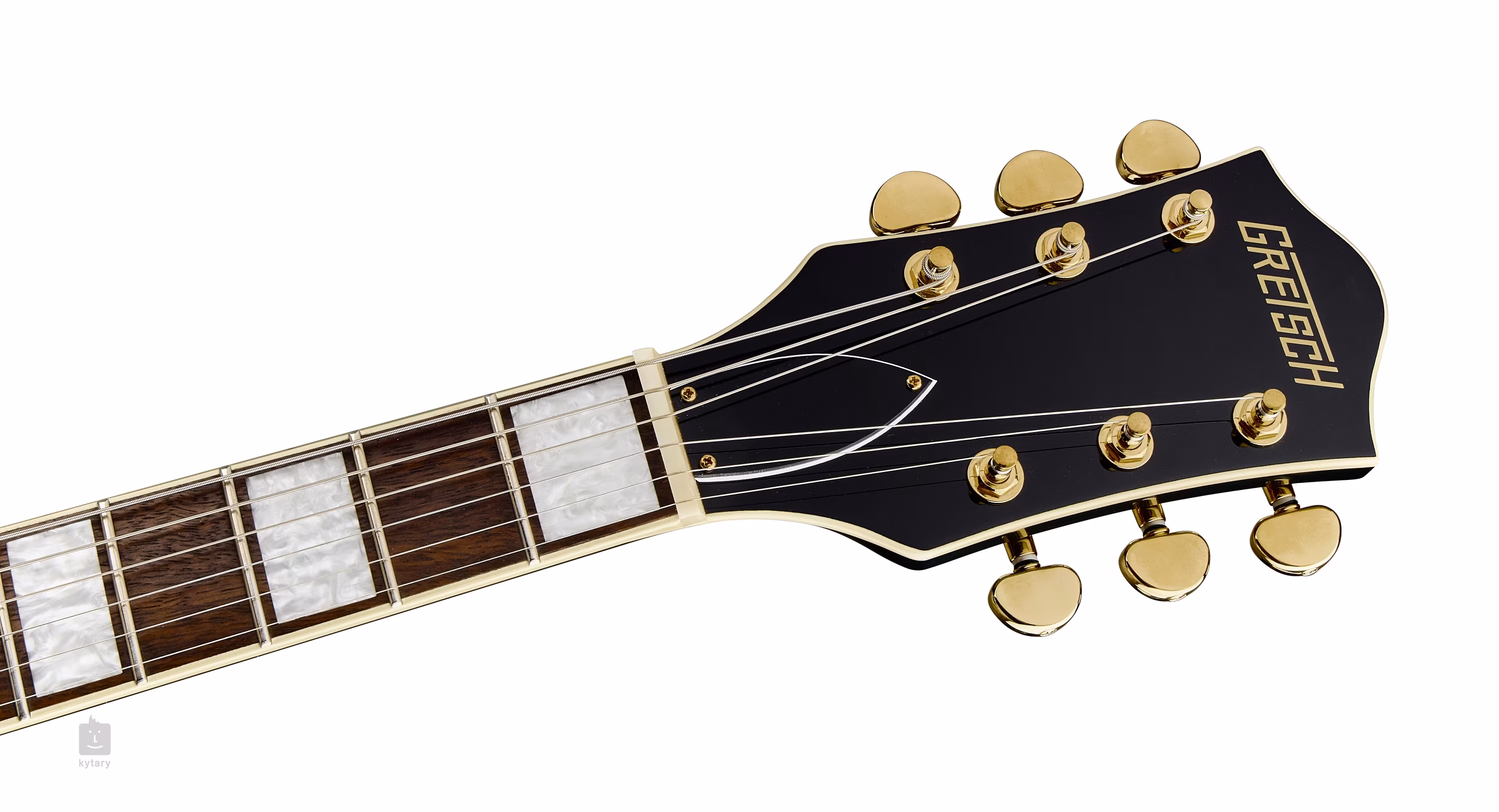 Die Verankerung der Saiten erfolgt über einen Knochen-Nullbund in der hauseigenen Druckguss-Mechanik und über einen Adjusto-Matic-Schuster, der auf einer Holzbasis in einem lizenzierten Bigsby B60-Tremolo sitzt. Das klassische, ansprechende Design der Gretsch-Gitarren wird durch eine Reihe stilvoller Merkmale unterstrichen - von der gewölbten F-Loch-Korpuskonstruktion, dem schlanken Perimeter-Binding, dem schwarzen Schlagbrett und der goldfarbenen Hardware.