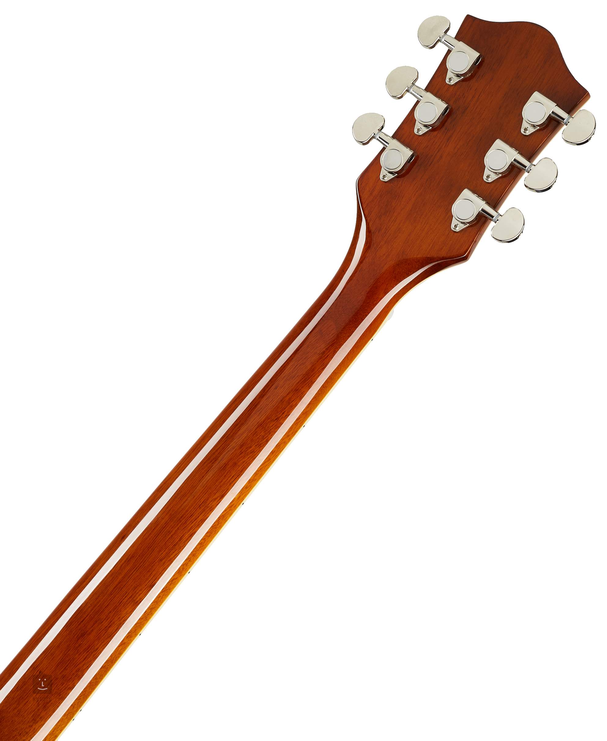 Die präzise Stimmung wird durch die Befestigung der Saiten über den künstlichen Knochen-Nullbund in den Die-Cast-Stimmmechaniken des Unternehmens und durch den Adjusto-Matic-Saitenhalter gewährleistet, der auf einem massiven Holzsockel und Saitenhalter (V-Stoptail) montiert ist. Das klassische, ansprechende Design der Gretsch-Gitarren wird durch eine Reihe von Styling-Merkmalen akzentuiert - von der gewölbten Korpuskonstruktion mit ausgestellten F-Löchern für eine verbesserte akustische Projektion, elegantem Binding mit einem subtilen Hauch von Patina (Aged White) und schwarz-weißem Schlagbrett, Potentiometern im Vintage-Stil, Nickel-Hardware und einem dreilagigen Schlagbrett aus Schildpatt-Imitat.