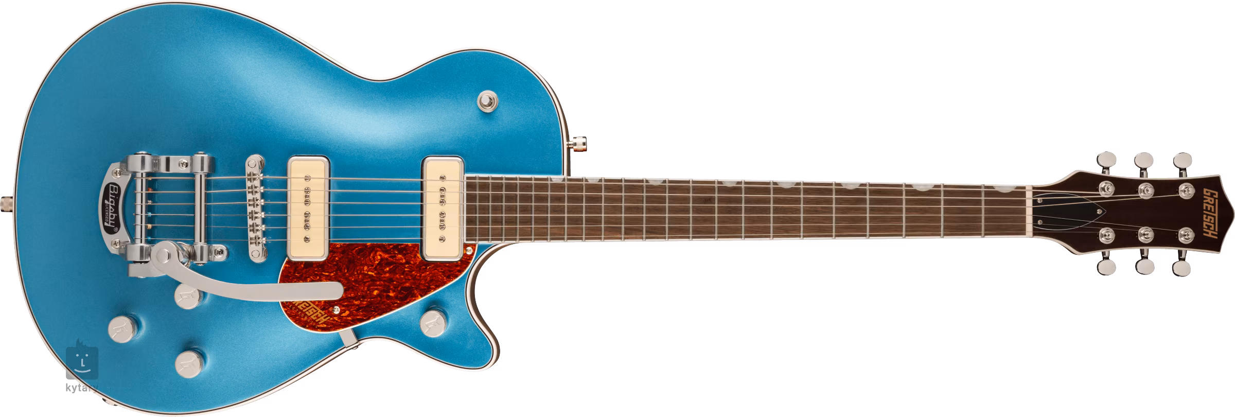 Die Saiten werden in die die-cast-Stimmmechaniken des Unternehmens eingespannt und über den Adjusto-Matic-Saitenhalter in ein Bigsby-Tremolo. Das stilvolle Design des Instruments wird durch traditionelle Akzente in Form einer hellen Korpusumrandung, die durch schwarze und weiße Linien ergänzt wird, Nickel-Hardware und ein Schlagbrett aus Schildpatt-Imitat mit goldenem Gretsch-Logo akzentuiert.