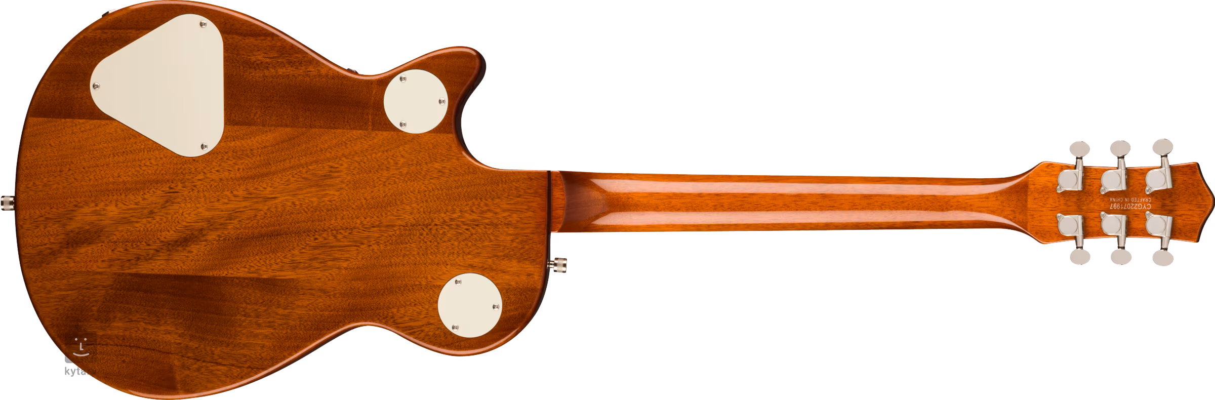 Die Saiten werden in die die-cast-Stimmmechaniken des Unternehmens eingespannt und über den Adjusto-Matic-Saitenhalter in ein Bigsby-Tremolo. Das stilvolle Design des Instruments wird durch traditionelle Akzente in Form einer hellen Korpusumrandung, die durch schwarze und weiße Linien ergänzt wird, Nickel-Hardware und ein Schlagbrett aus Schildpatt-Imitat mit goldenem Gretsch-Logo akzentuiert.