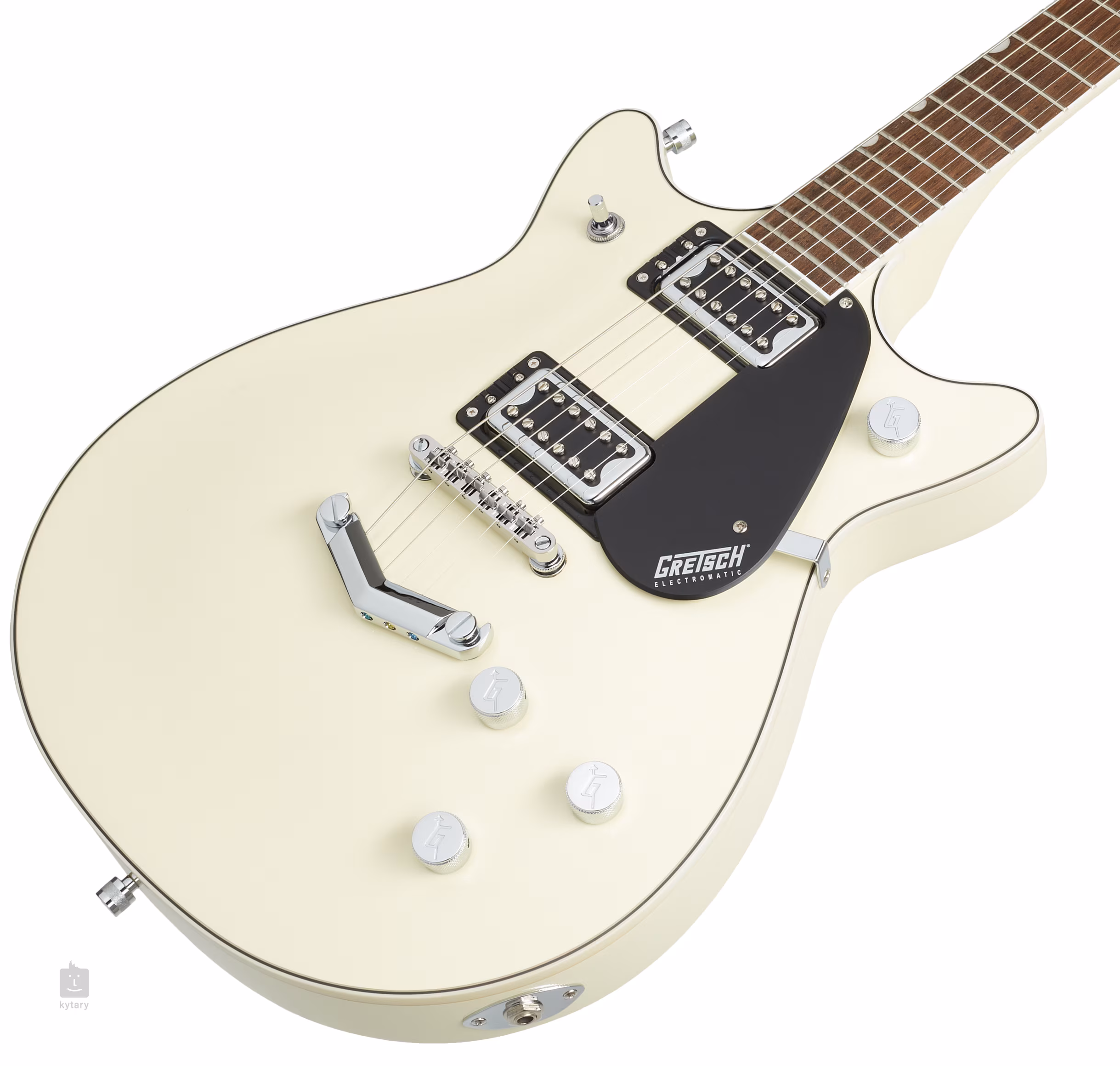 Das Gretsch G5222 Vintage White Double-Cut Modell ist Teil der Electromatic Serie. Der gekammerte Mahagonikorpus der Gitarre ist mit einer gewölbten Ahorndecke verziert. Auf den Mahagoni-Hals mit Thin-U-Profil ist ein Feigengriffbrett mit zweiundzwanzig Medium-Jumbo-Bünden geklebt. Die Orientierung auf der Oberfläche wird durch versetzte Positionsmarkierungen aus Perlmuttimitat (Neo-Classic Thumbnail) erleichtert.