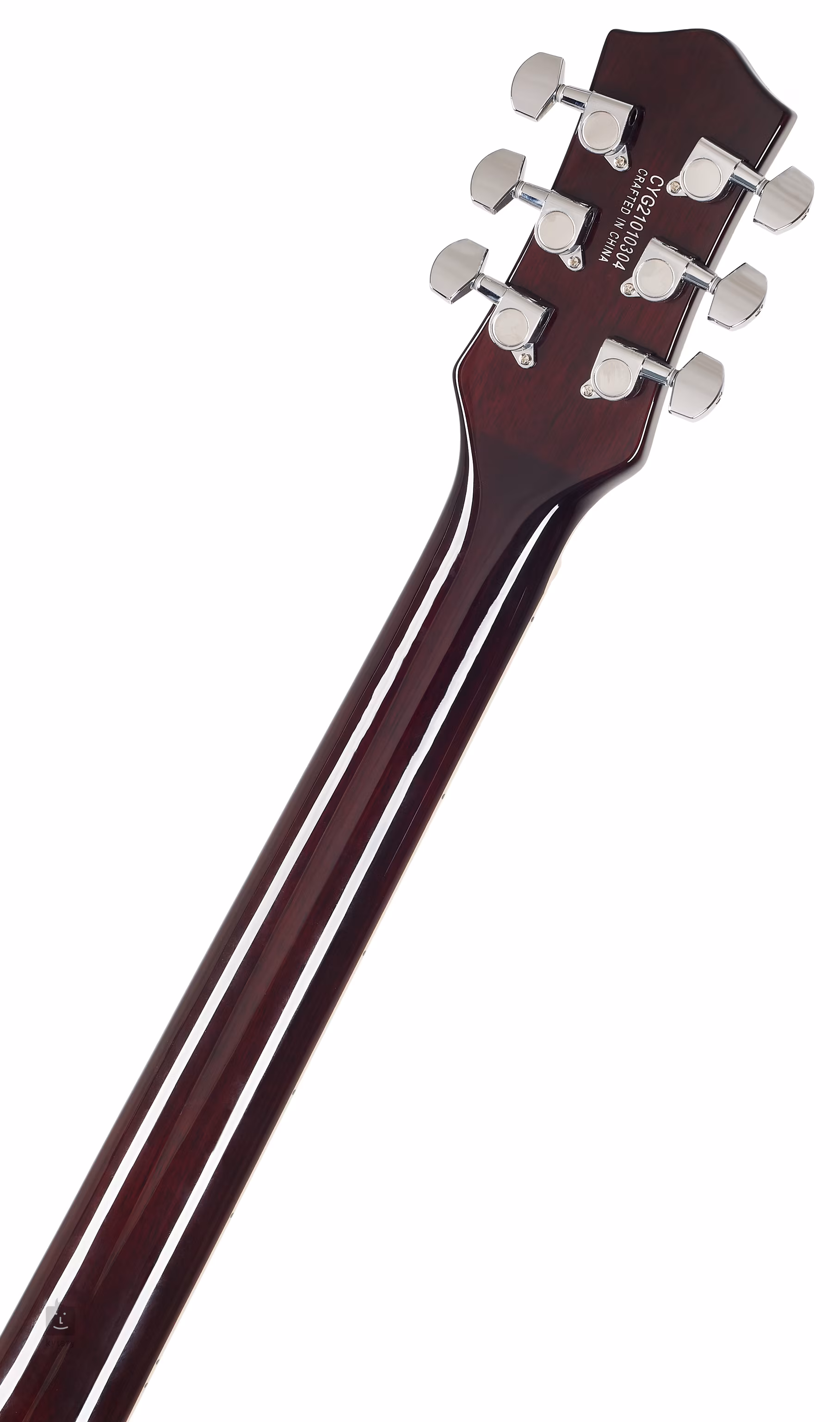 Die Saiten sind in den Die-Cast-Mechaniken des Unternehmens, dem einstellbaren Adjusto-Matic-Saitenhalter und den Gretsch V Stoptail-Saitenhaltern untergebracht. Das stilvolle Design des Instruments wird durch traditionelle Elemente in Form einer hellen Korpuseinfassung akzentuiert, die durch schwarze und weiße Linien, verchromte Hardware und ein schwarzes Schlagbrett ergänzt wird.