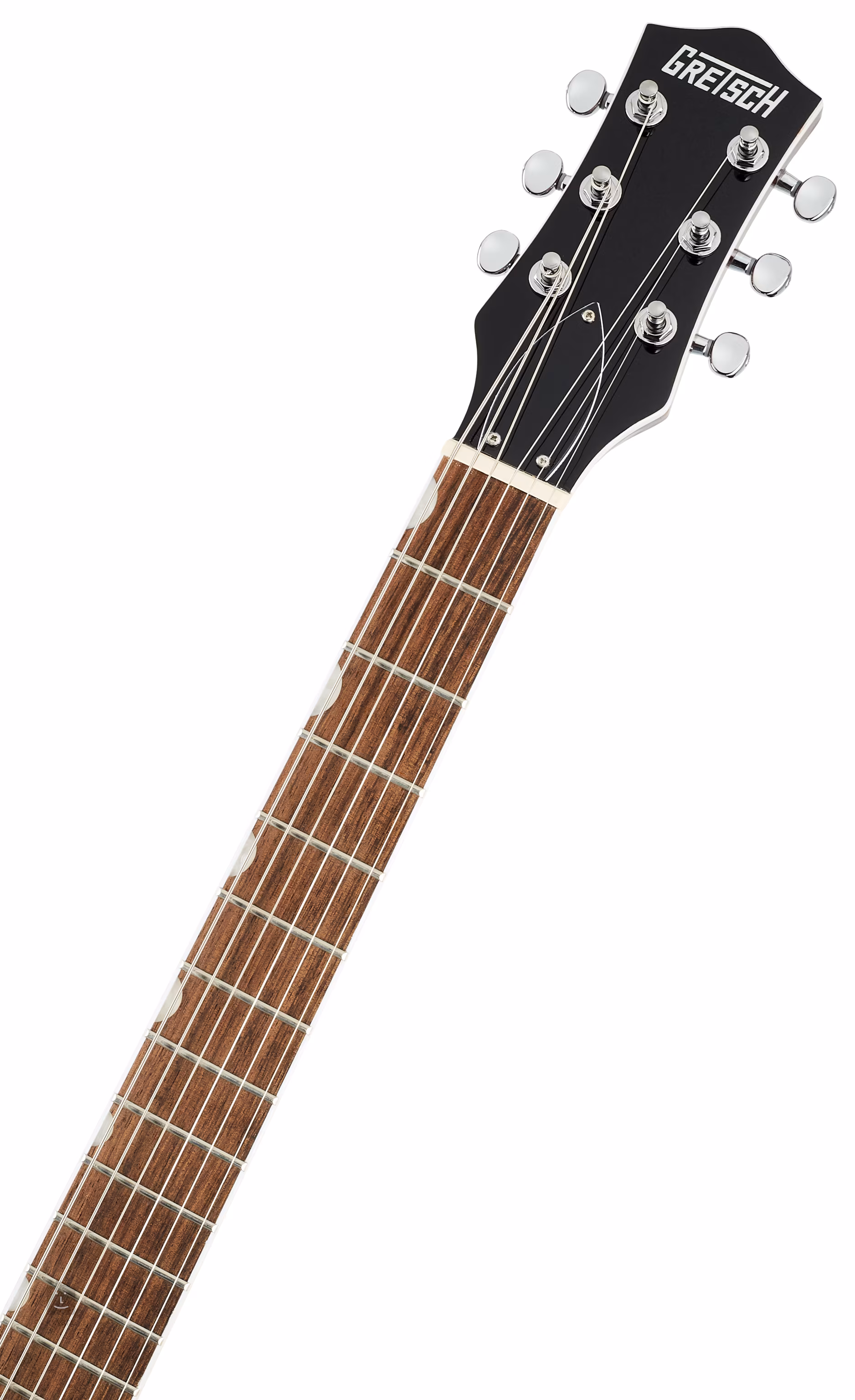 Die Saiten sind in den die-cast-eigenen Stimmmechaniken und dem Bigsby-Tremolo untergebracht. Das stilvolle Design des Instruments wird durch verchromte Hardware und ein silbernes Plexi-Pickguard mit schwarzem Gretsch-Firmenlogo passend ergänzt.