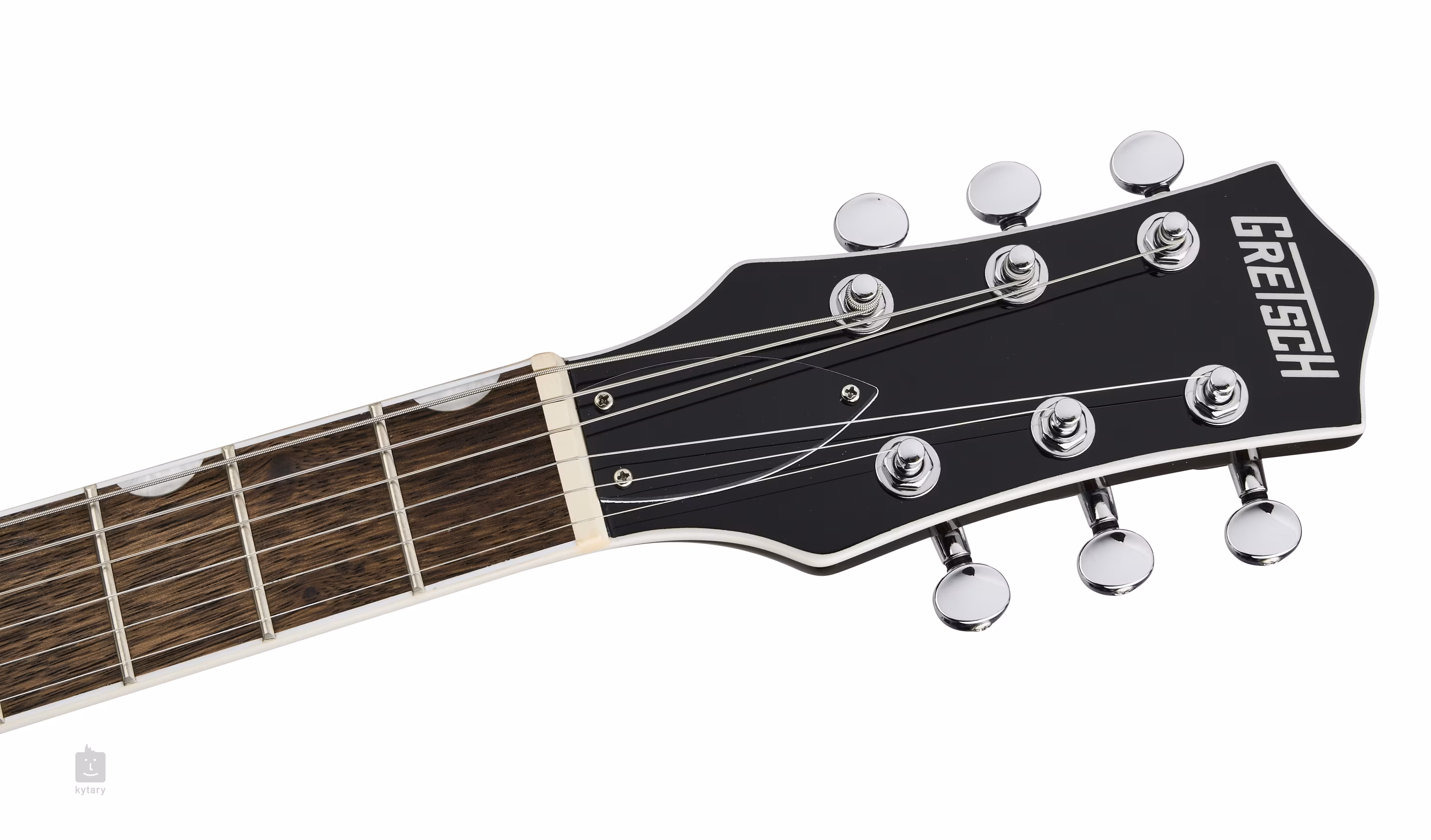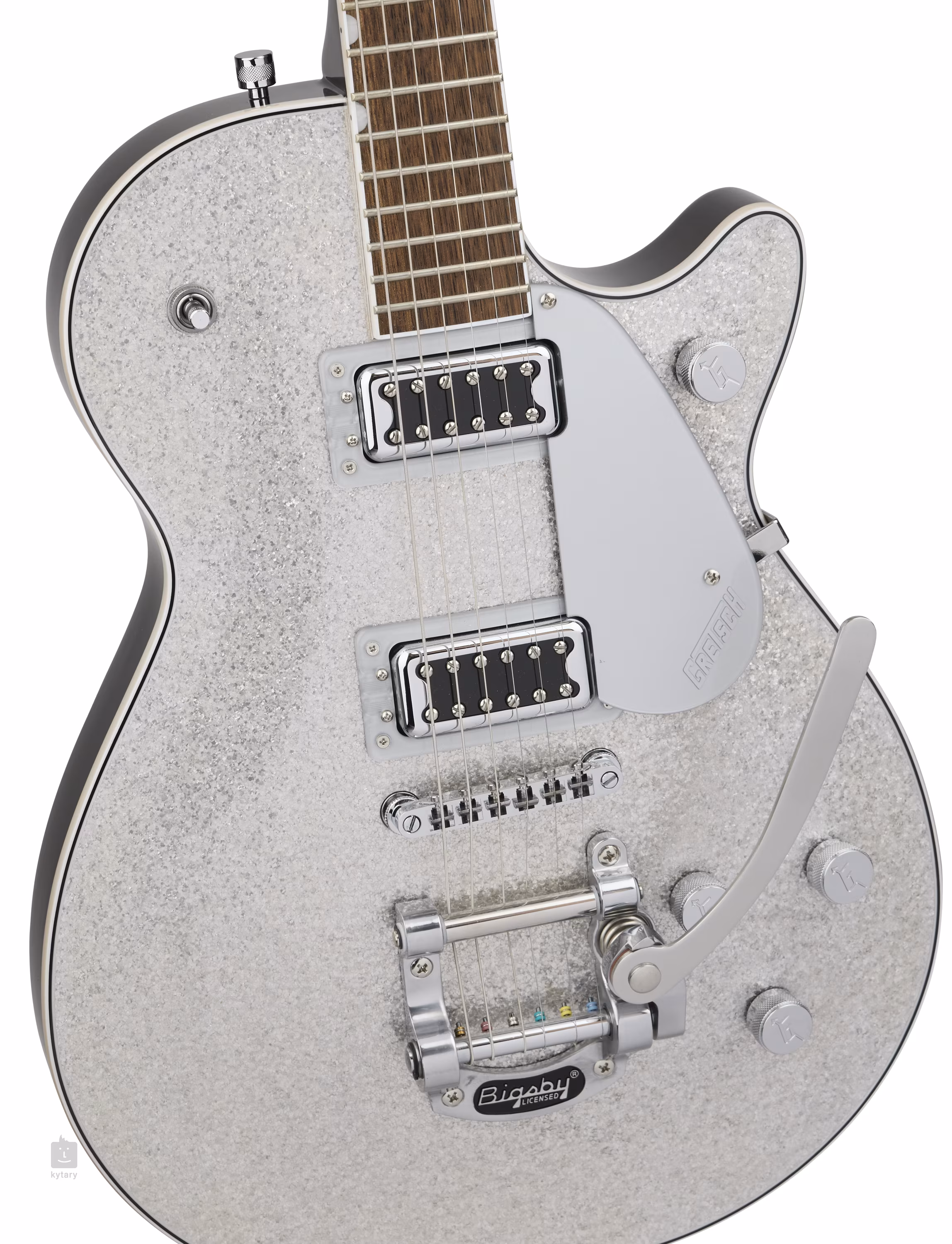 Die Saiten sind in der Druckgussmechanik des Unternehmens sowie in einer Adjusto-Matic-Kopfplatte und einem Bigsby B50-Tremolo montiert. Das stilvolle Design des Instruments wird durch verchromte Hardware und ein silbernes Plexi-Pickguard mit dem Gretsch-Firmenlogo in Silber akzentuiert.