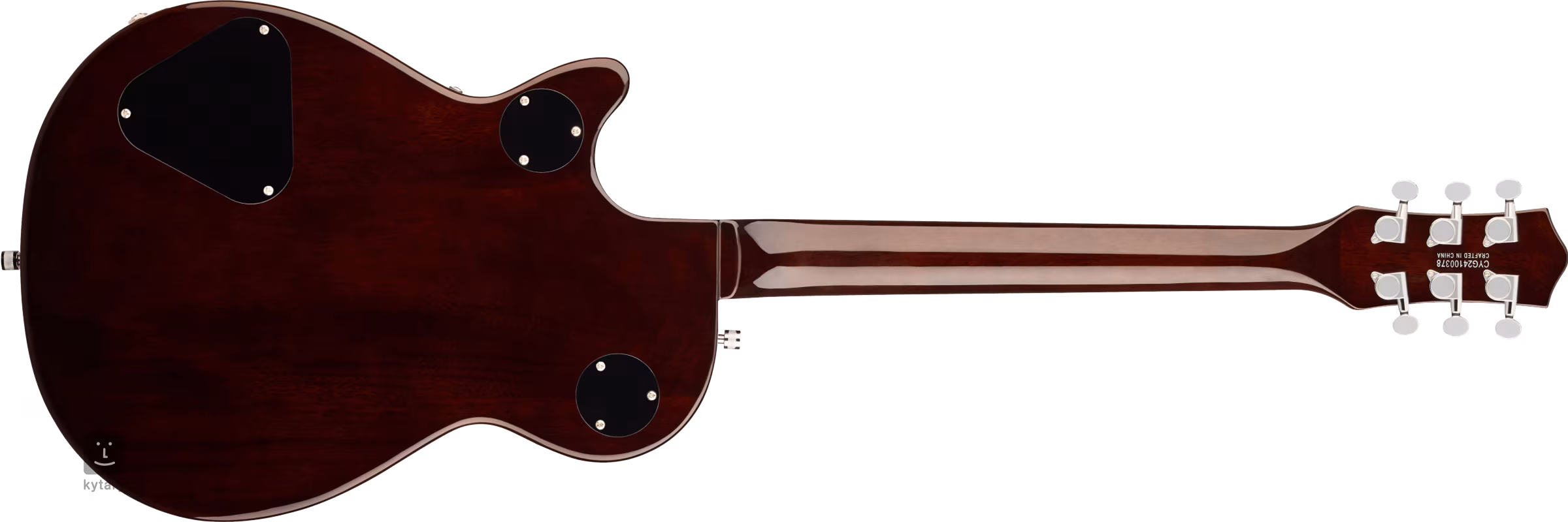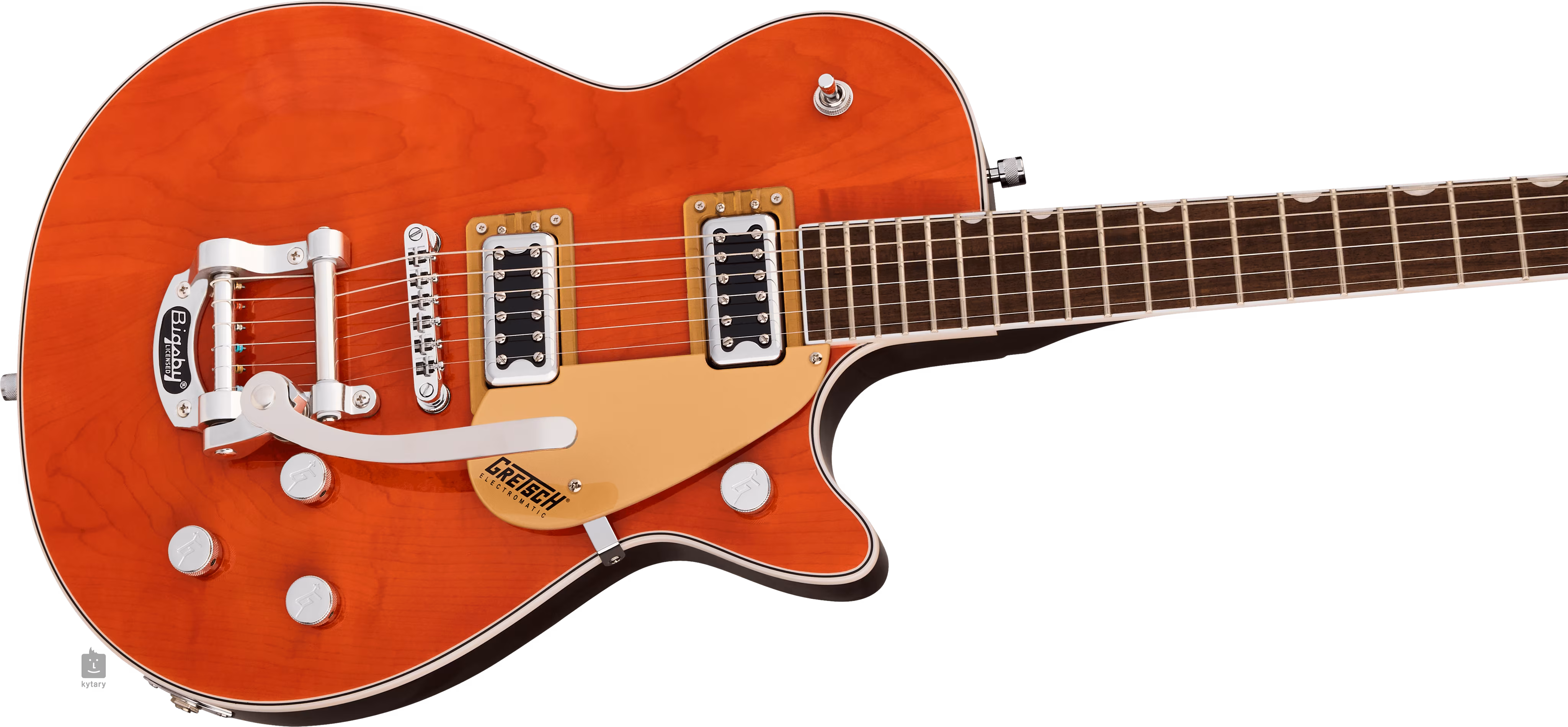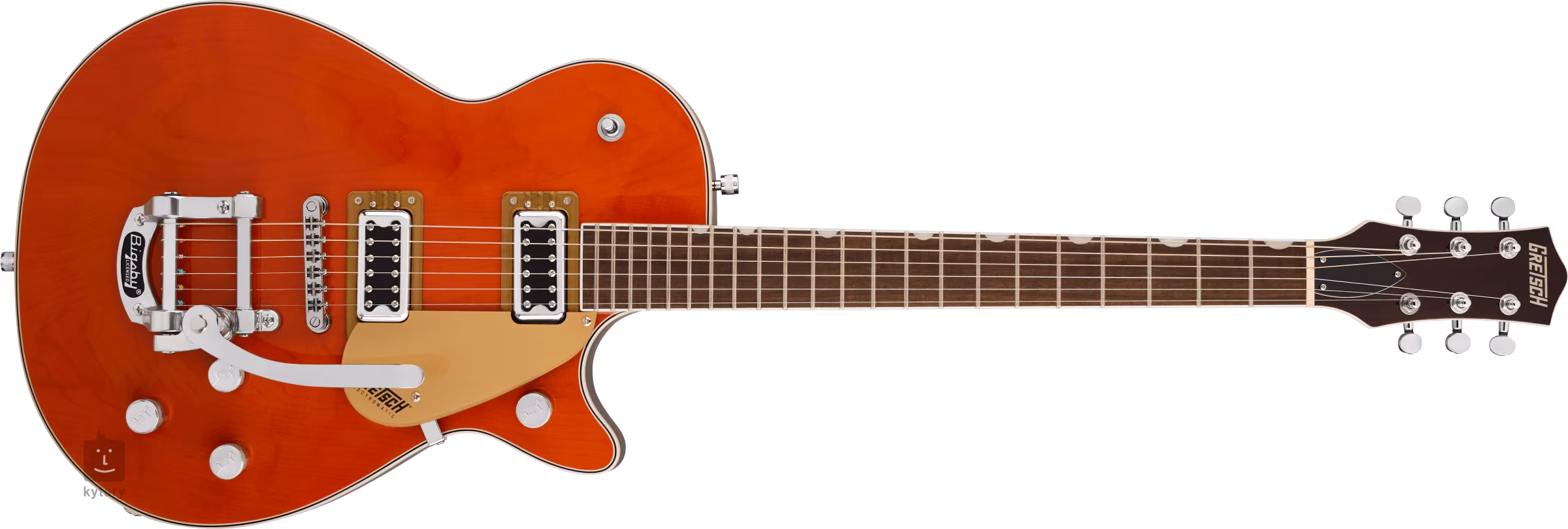 Die Saiten sind in die Druckgussmechanik des Unternehmens sowie in eine Adjusto-Matic-Kopfplatte und ein Bigsby B50-Tremolo eingebaut. Das stilvolle Design des Instruments wird durch Nickel-Hardware und ein Gold-Plexi-Schlagbrett mit schwarzem Gretsch-Firmenlogo akzentuiert.