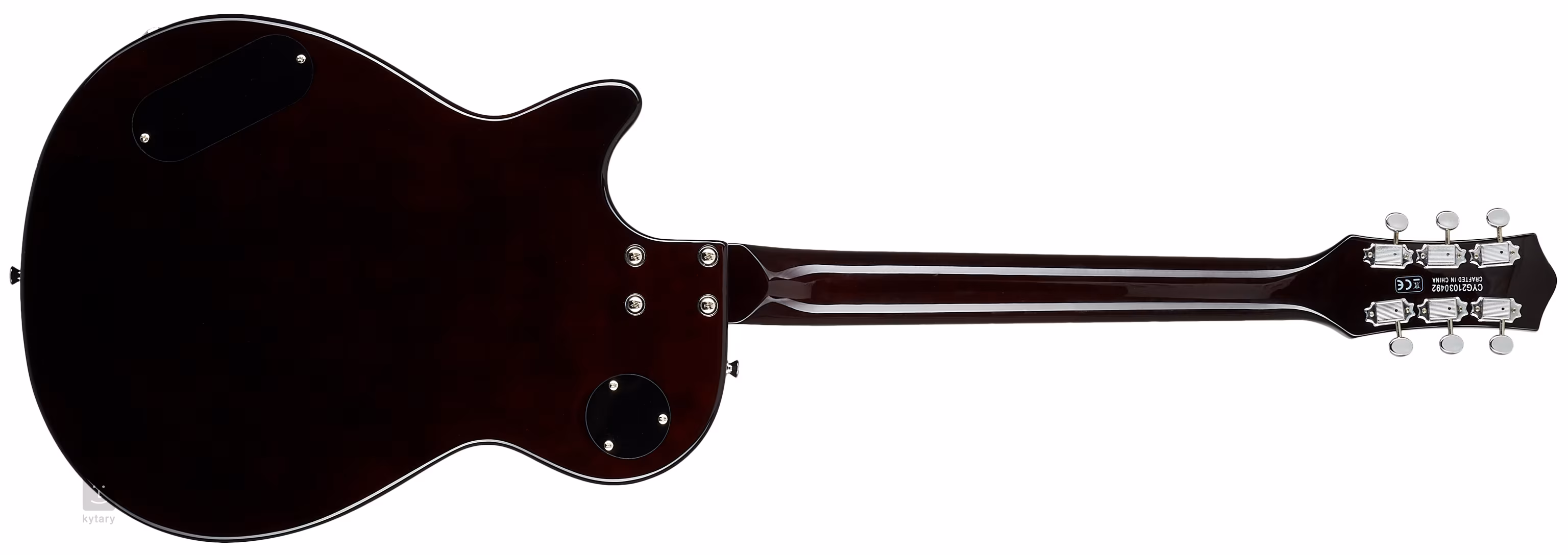 Das Modell Jet Club hat einen Korpus aus massivem, gekammertem Lindenholz mit einer laminierten Ahorndecke. Der Hals, der mit dem Korpus verschraubt ist, besteht aus Ahorn. Es wird ein Palisandergriffbrett mit einem Radius von 12 Zoll verwendet. Auf der 625-Millimeter-Mensur finden Sie 22 Medium-Jumbo-Bünde. Die Breite des Nullbundes aus synthetischem Knochen beträgt 43 Millimeter.