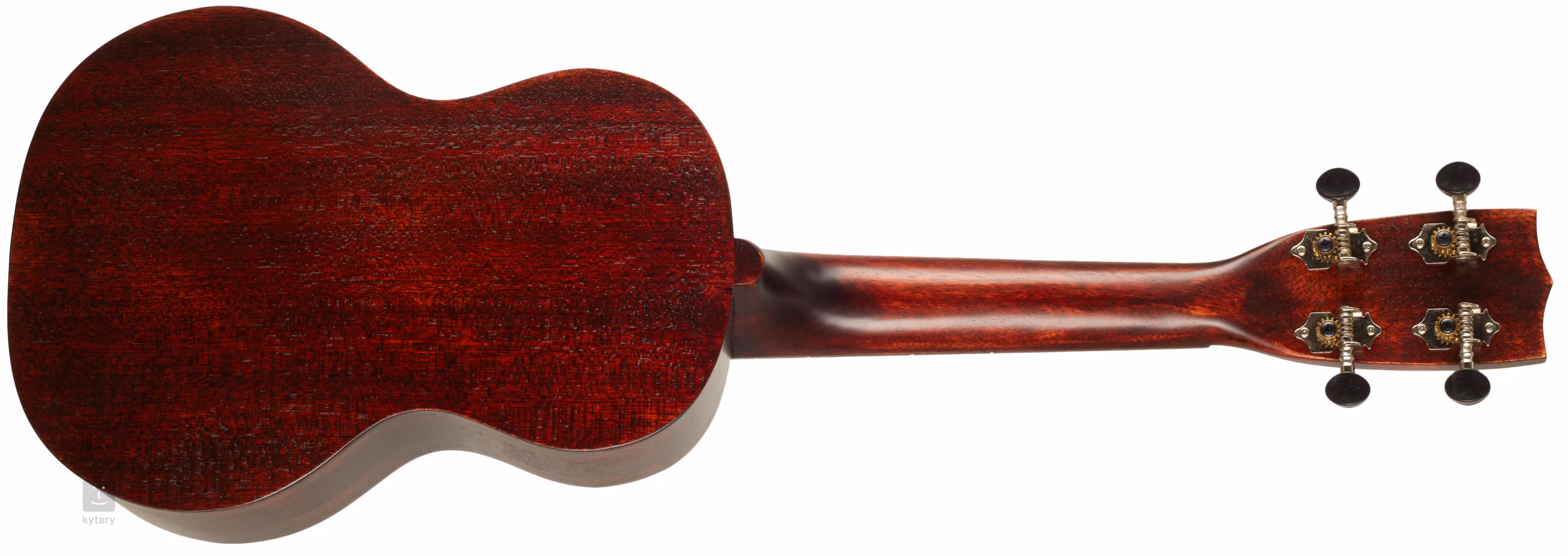 Diese Konzert-Ukulele besteht aus einer Mahagoni-Resonanzdecke und Boden und Zargen aus demselben Material. Der Hals mit Medium U-Profil ist ebenfalls aus Mahagoni gedreht, während das Ovangkol-Griffbrett 16 Bünde aufweist. Die Mensur beträgt 343 Millimeter, der Sattel und die Nullbünde sind 35 Millimeter breit.