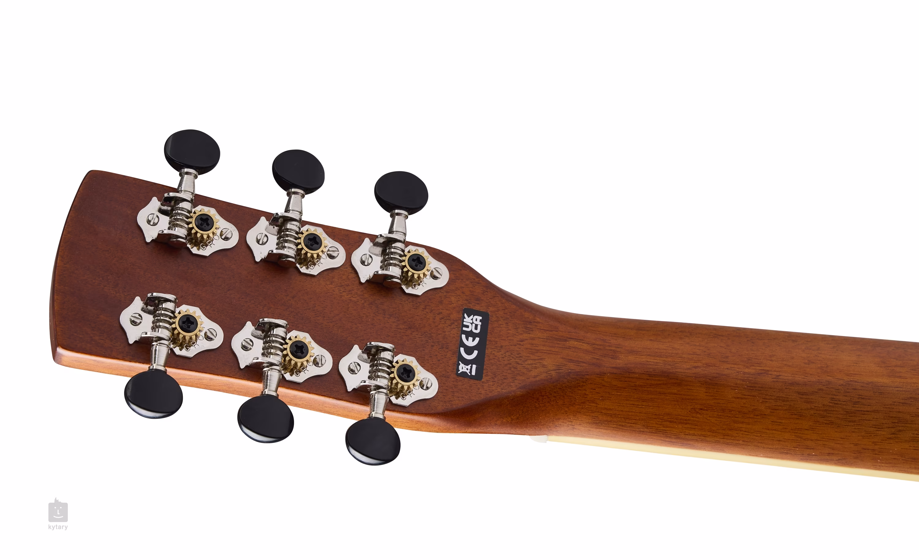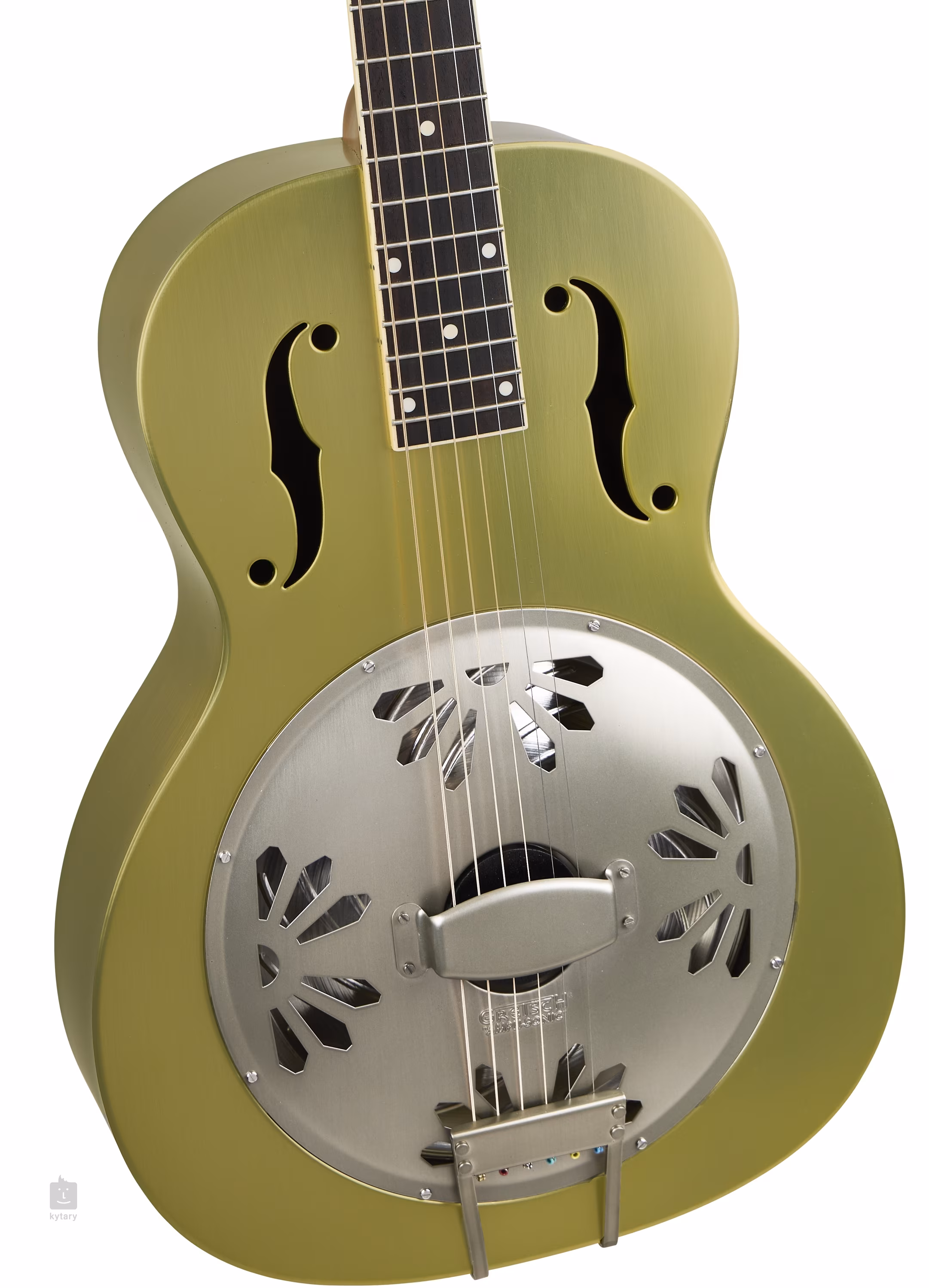 Die Saiten sind in Grover-Mechaniken eingespannt, das Biscuit-Ahorn-Griffbrett ist mit Ebenholz/Ahornsattel und Weathered Trapeze Tailpiece ausgestattet. Der stilvolle Look des Resonators wird durch die Bell Bronze"-Lackierung mit verwittertem "Bell Bronze"-Finish, Aged White-Griffbrettbindung und Nickel-Hardware unterstrichen.