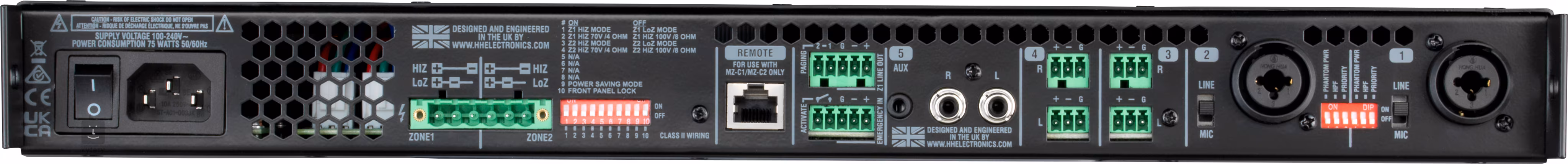 Die Zonenausgänge werden über einen einzelnen 5,08-mm-Euroblock-Anschluss für den Anschluss an Ihre Passivlautsprecher bereitgestellt, der 10 DIP-Schalter zur Einstellung der Zonenkonfigurationen umfasst. Darüber hinaus gibt es einen Ethernet-Ausgang für den Anschluss eines drahtlosen MZ-C2-Controllers, einen symmetrischen Euroblock-Anschluss für die Integration mit Brandmeldeanlagen und einen 3,5-mm-Euroblock-Anschluss, der als Line-Ausgang (3 Pins) oder als Anschluss für manuelle Durchsagen (2 Pins) dient.