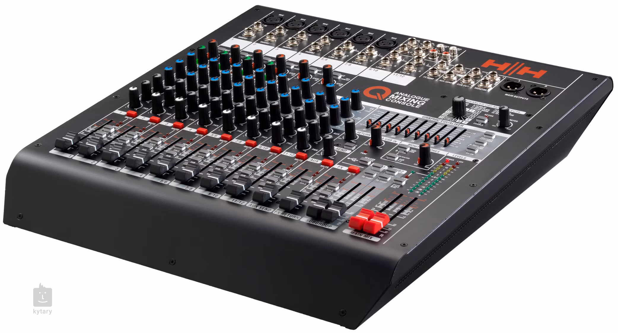 Das analoge Mischpult H&H Q12FX ist ein kompaktes Gerät mit zwölf Kanälen, das sowohl für die Beschallung von Bars, Clubs, kleinen Festivals, Konferenzen oder Vorträgen als auch für die Aufnahme von Musik, Podcasts und Voiceovers eingesetzt werden kann.