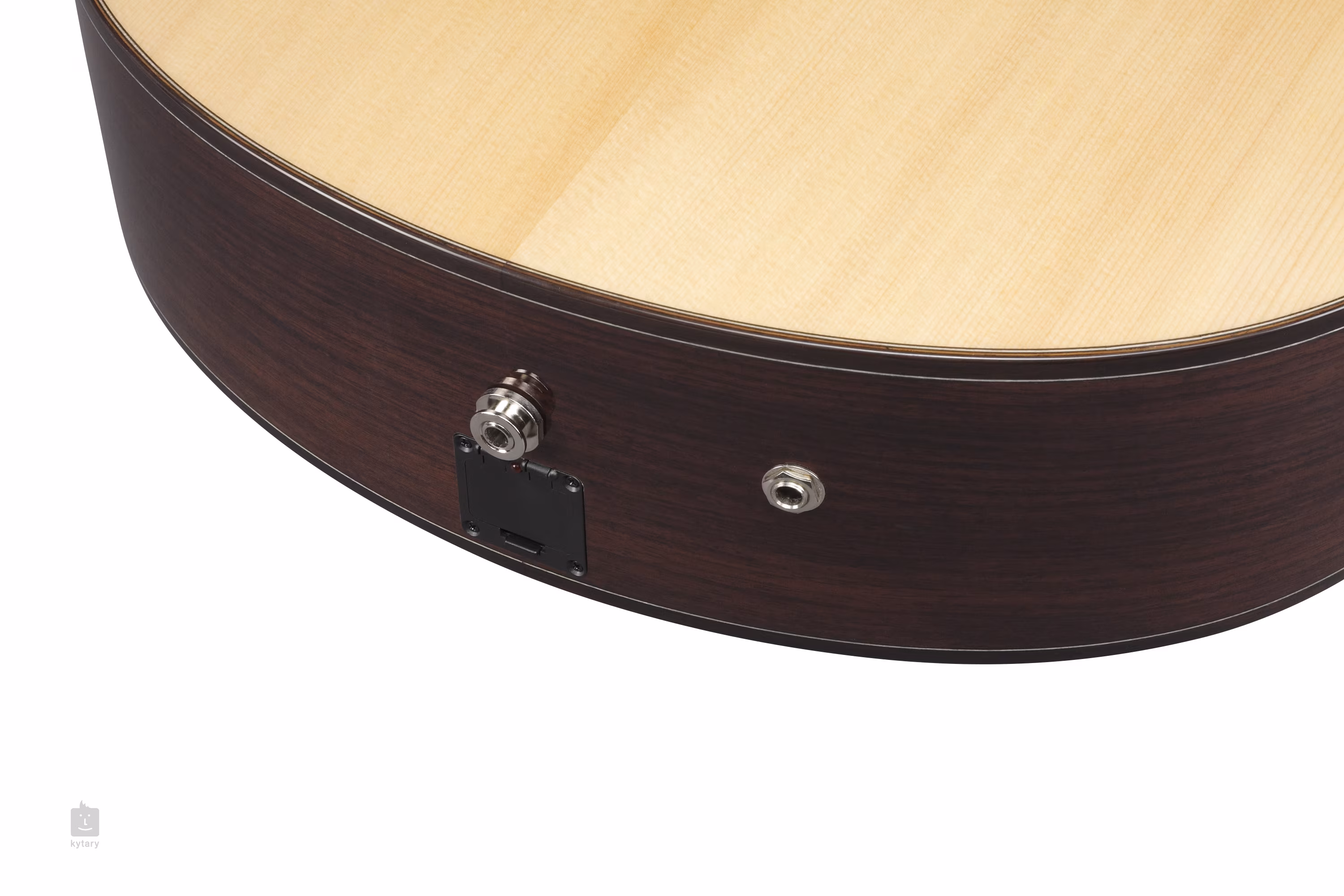 Die Vorderseite der AAM380CE-NT ist aus massiver Sitka-Fichte gefertigt, während Boden und Zargen aus Palisander-Sperrholz bestehen. Der Hals aus afrikanischem Mahagoni ist mit einem 20-Bund-Griffbrett aus Makassar-Ebenholz verleimt. Die Wärmebehandlung des Halses (Thermo Aged) verleiht dem Holz mehr Stabilität und eine bessere Resonanz, die auch durch die reduzierte X-M Verrippung (optimale Übertragung der Saitenschwingungen auf den Korpus) unterstützt wird.