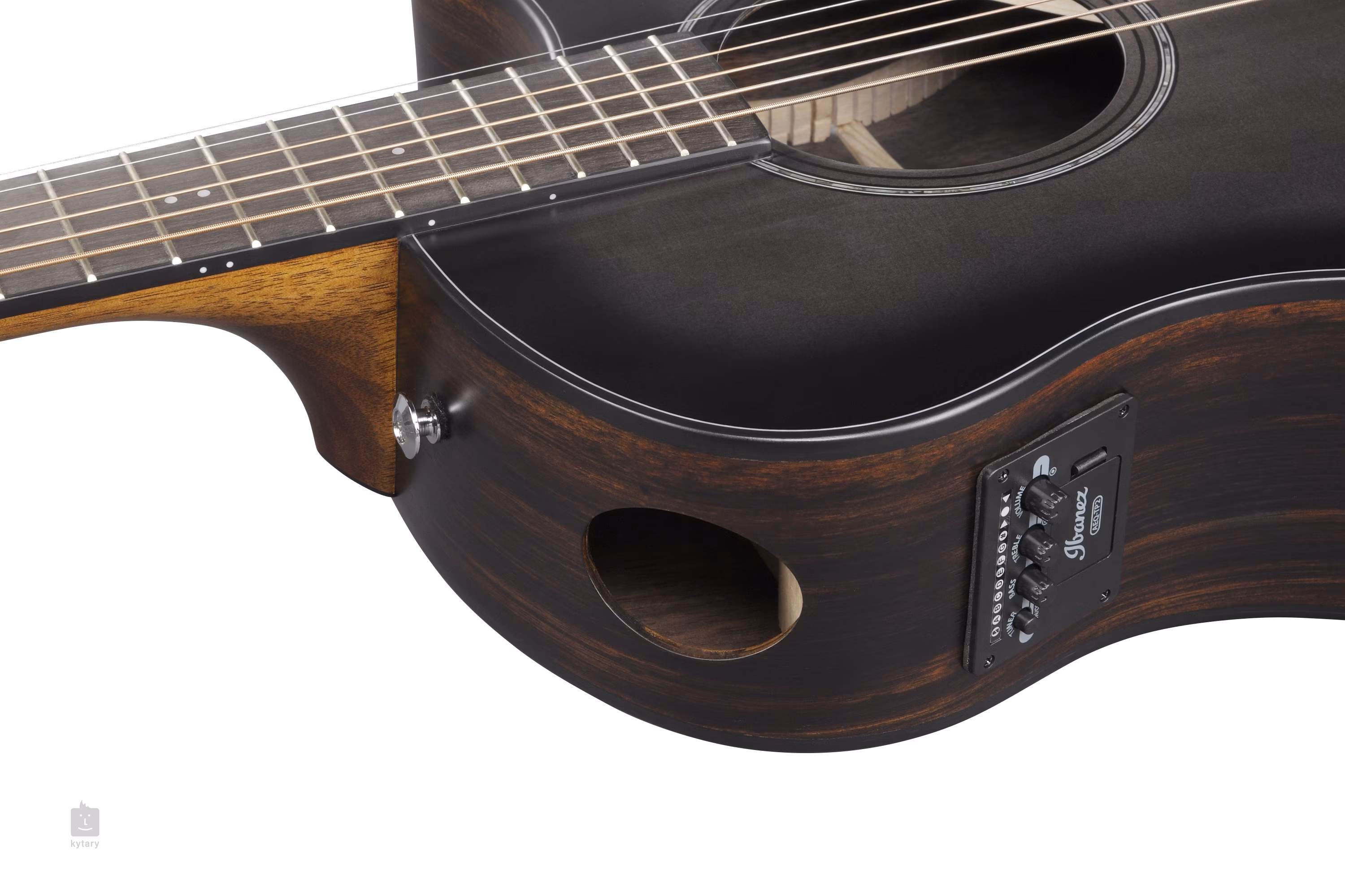 Die Saiten sind in verchromten Druckguss-Zahnrädern mit einer Übersetzung von 18:1 und einem Griffbrett aus Purpleheart montiert. Die Ibanez Advantage-Wirbel bieten gegenüber den Standardmodellen Vorteile in Bezug auf einfache Handhabung und festen Sitz der Saiten. Der stilvolle Look des Instruments wird durch traditionelle Elemente in Form einer schwarzen Korpusumrandung, einer Perlenrosette (Abalone) und einem Schlagbrett aus Schildpatt-Imitat unterstrichen.