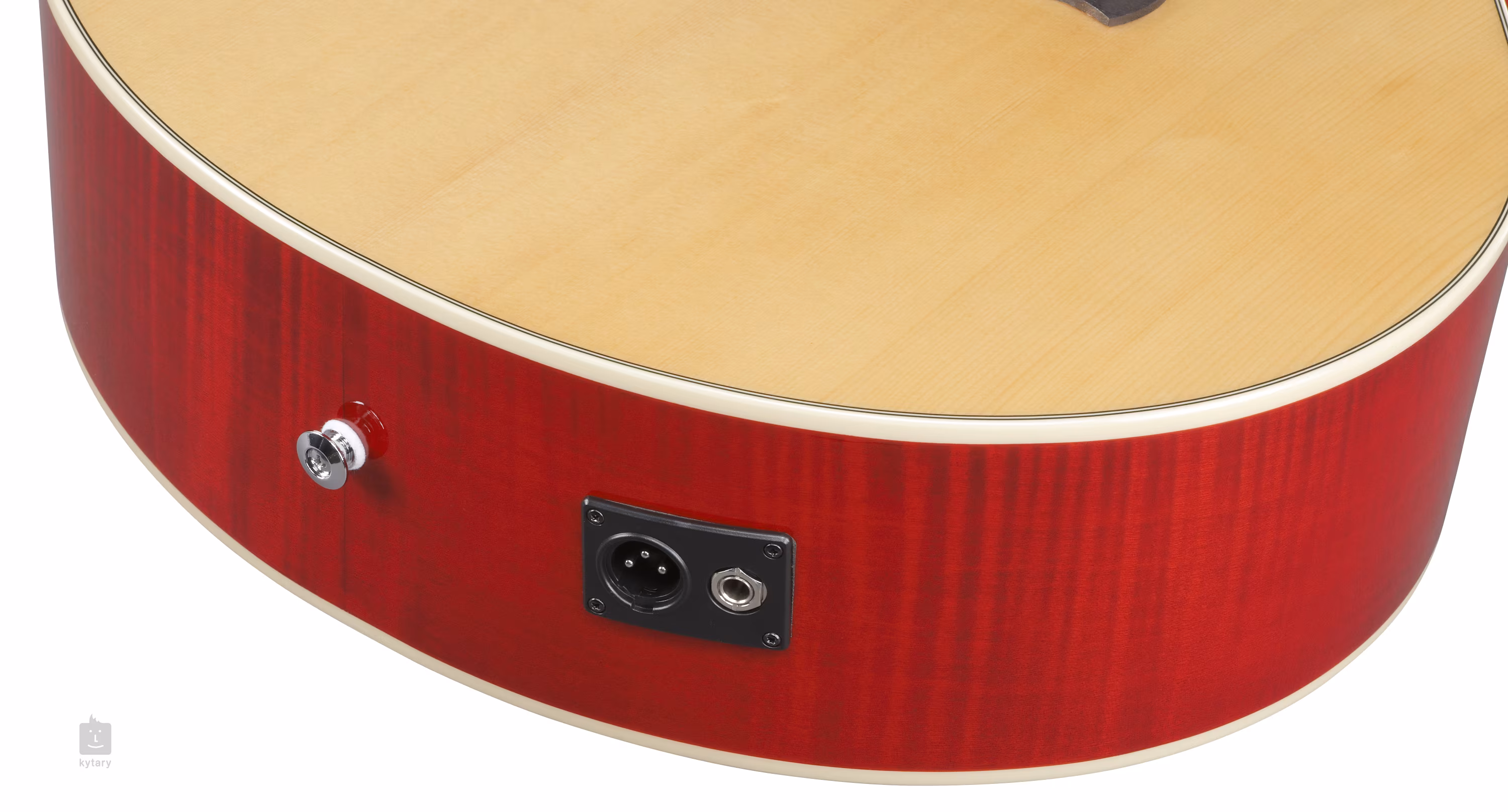 Die Frontplatte der AE170-NTR ist aus massiver Sitka-Fichte gefertigt, während Boden und Zargen aus laminiertem, geflammtem Ahorn bestehen. Die Fichtendecke ist mit einer glänzenden Lackierung versehen, das Muster des geflammten Ahorns wird durch die glänzende Transparent Red-Lackierung hervorgehoben. Der Ahornhals ist auf ein hitzebehandeltes Ovangkol-Griffbrett mit zwanzig Bünden geleimt. Sorgfältig entworfene, reduzierte X-M-Rippen und die Anordnung der Rippen sorgen für eine effiziente Übertragung der Saitenschwingungen über das Griffbrett auf den Korpus. Ein interessantes Merkmal ist das speziell entwickelte Loch auf der Rückseite des Instruments (A.I.R.port), durch das man besser hören und fühlen kann, was man spielt.