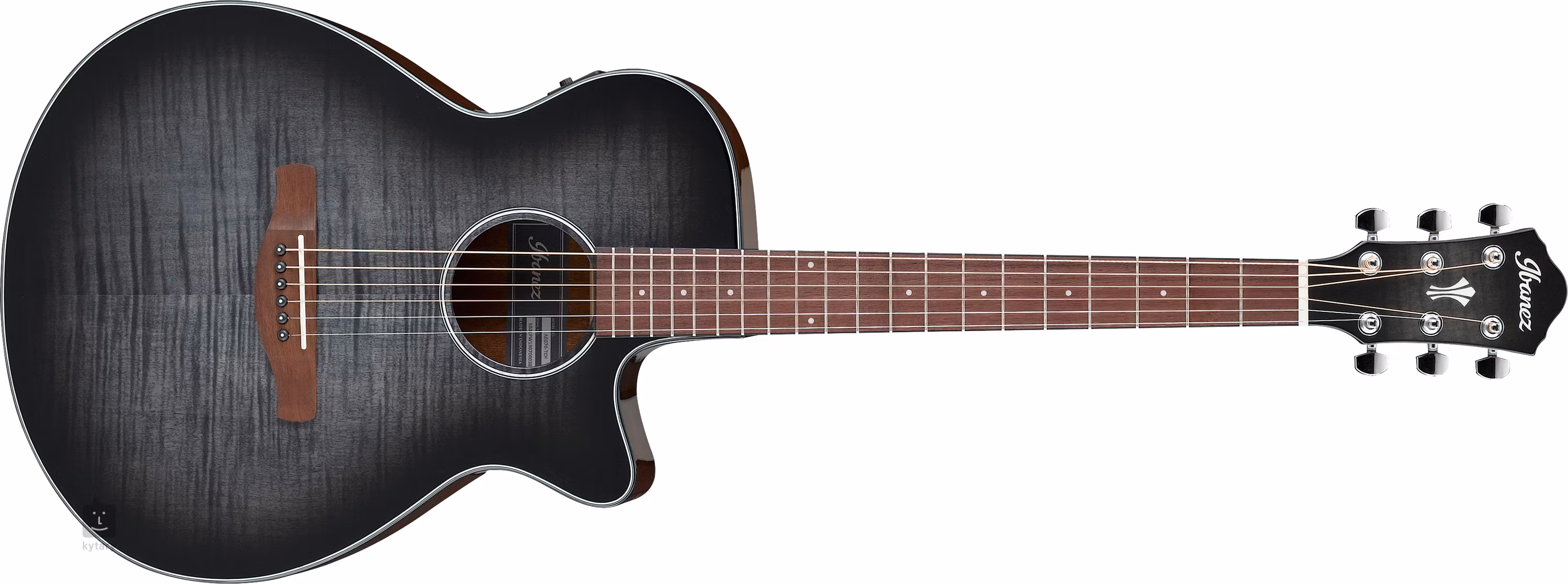 Der mehrschichtige Korpus der AEG70-TCH besteht aus gemasertem Ahorn auf der Vorderseite und afrikanischem Sapele auf Boden und Zargen. Die auffällige Maserung des geflammten Ahorns wird durch die glänzende Lackierung und die Transparent Charcoal Burst Deckenfarbe akzentuiert. Auf den Hals aus Nyatoh-Holz ist ein Palisandergriffbrett mit zwanzig Bünden geleimt. Der untere Korpusausschnitt erleichtert die Anpassung an das Griffbrett in den höchsten Lagen.