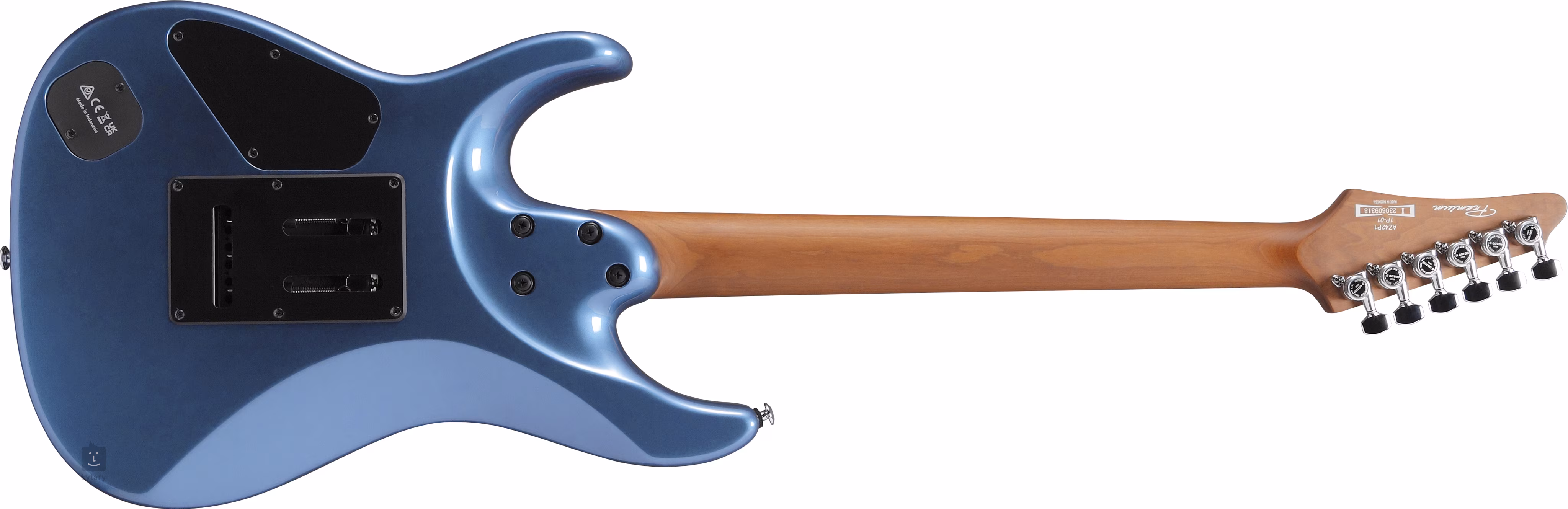 Der limonenfarbene Korpus der AZ42P1-PBE-Gitarre ist mit Preußisch Blau Metallic lackiert. Dank des ergonomischen Shapings der Rückseite des Korpus liegt die Gitarre perfekt in der Hand. Der Ahornhals ist auf ein Palisandergriffbrett geleimt, das mit vierundzwanzig Jumbo-Edelstahlbünden ausgestattet ist. Die Wärmebehandlung des Halses verbessert seine Stabilität, Haltbarkeit und Widerstandsfähigkeit gegen Wasser und Temperaturschwankungen und verleiht der Gitarre das Aussehen und das Gefühl eines ausgereiften/gespielten Instruments. Perlmutt-Positionspunkte und Leuchtmarkierungen an der Seite erleichtern die Orientierung auf dem Griffbrett.