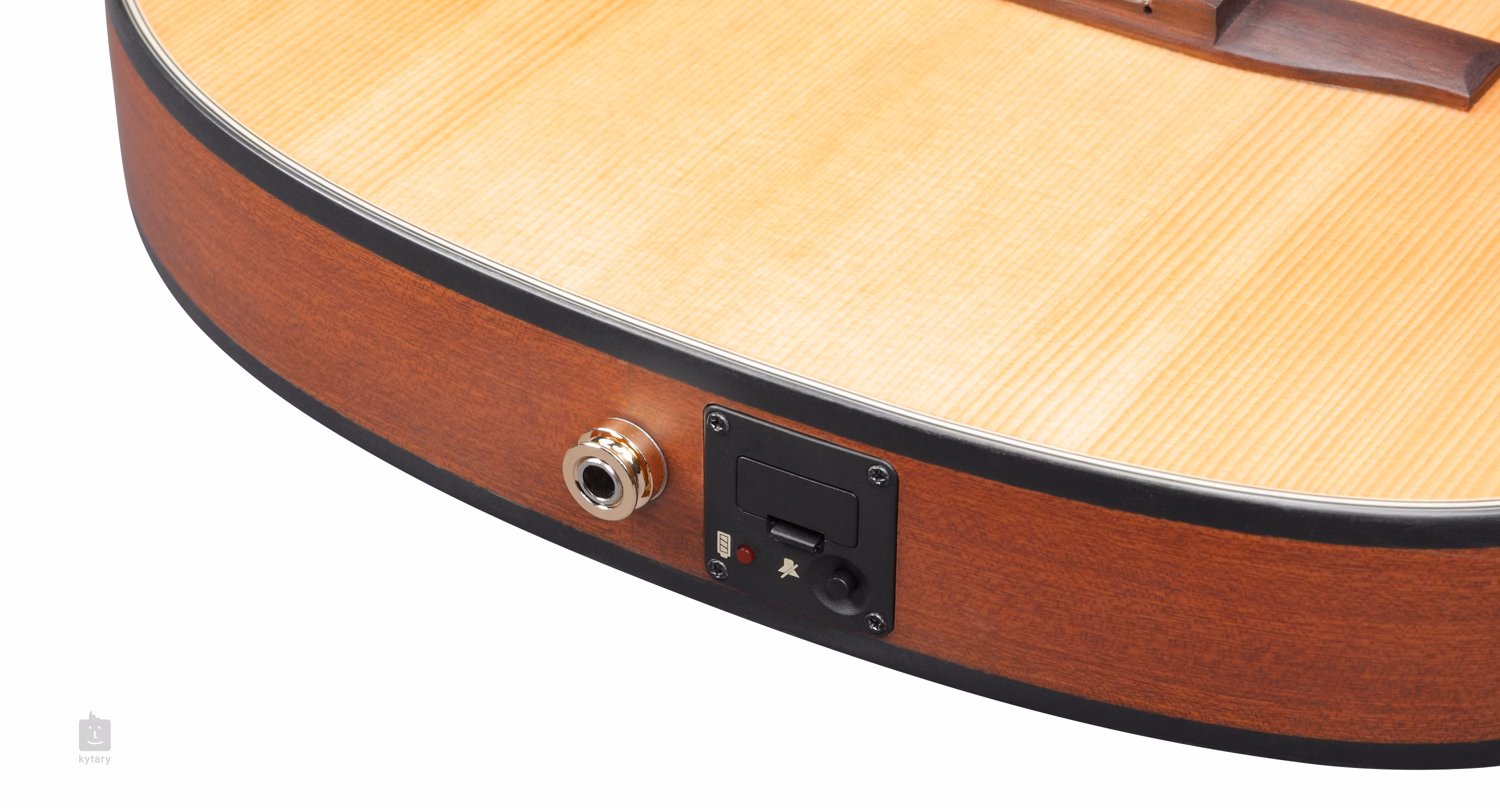 Die Vorderseite der FRH10N-NTF ist aus massiver Sitka-Fichte gefertigt, während Boden und Zargen aus laminiertem Sapele bestehen. Ein Walnuss-Griffbrett mit zweiundzwanzig Bünden ist auf einen Hals aus Nyatoh-Holz mit einem komfortablen C-Profil geleimt. Die Intonation der Gitarre wird von einem Ibanez T-Bar-Subwoofer mit einem Ibanez Custom-Vorverstärker übernommen. Die Saiten sind in klassischen Mechaniken mit Goldlack und Walnuss-Griffbrett montiert.