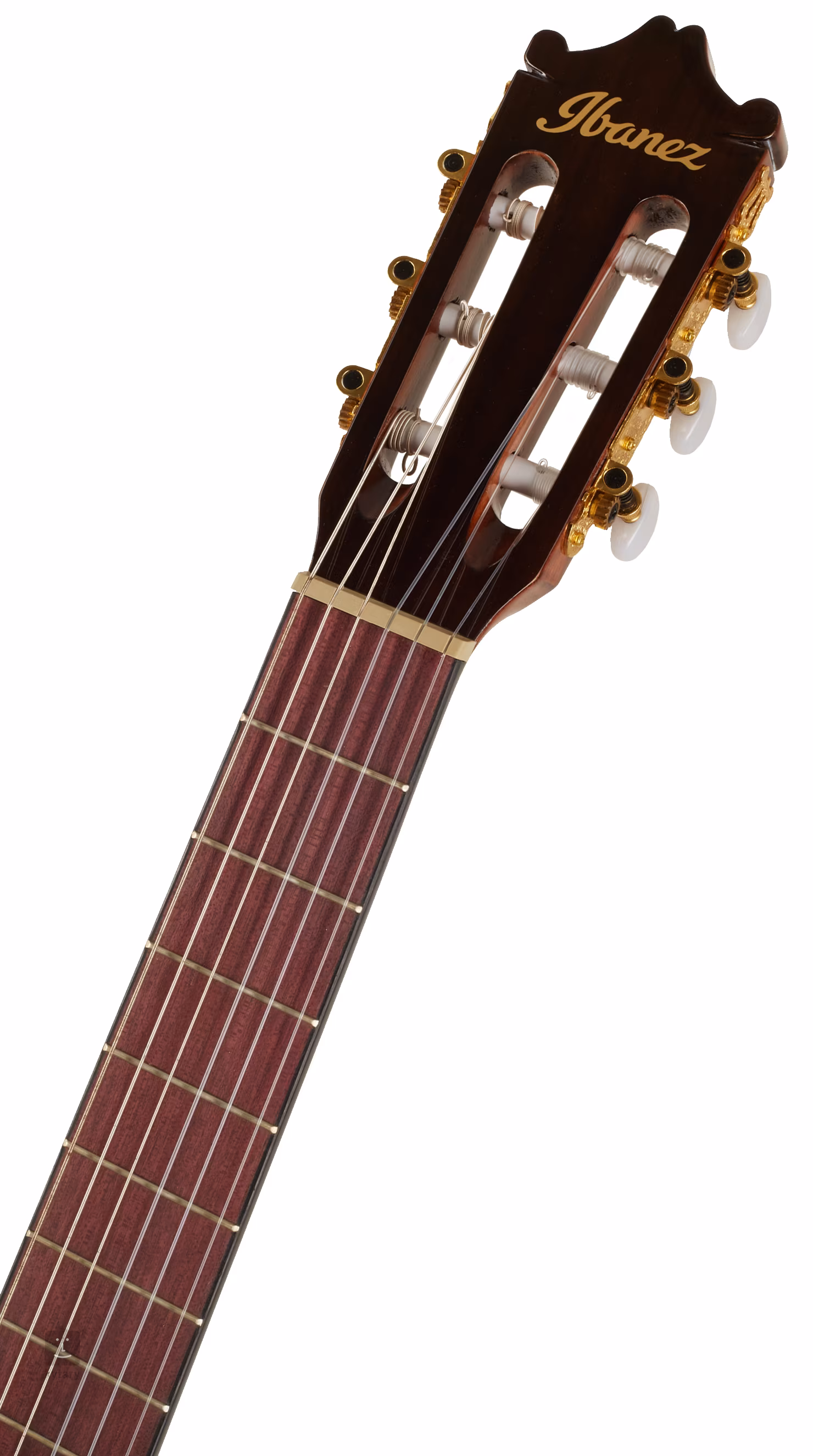 Der Sattel und das Griffbrett sind aus Kunststoff gefertigt. Die Hardware ist Gold sind Ibanez Classical Mechaniken verwendet. Die Werkssaiten sind D'Addario EXP Nylonsaiten.