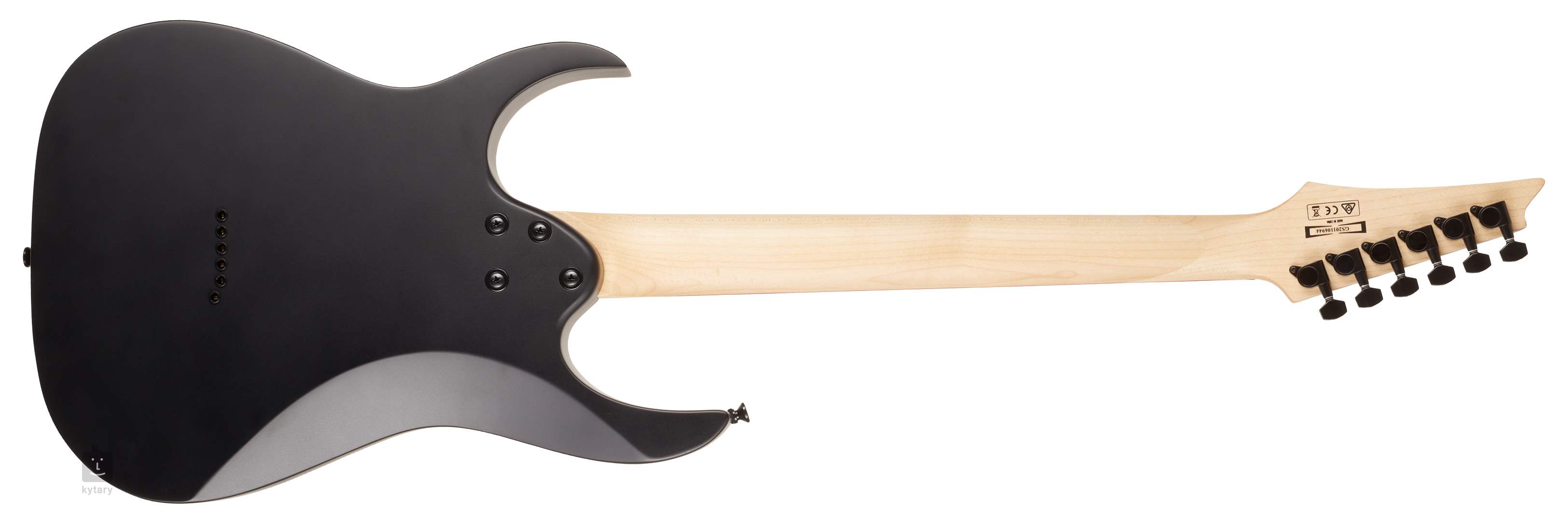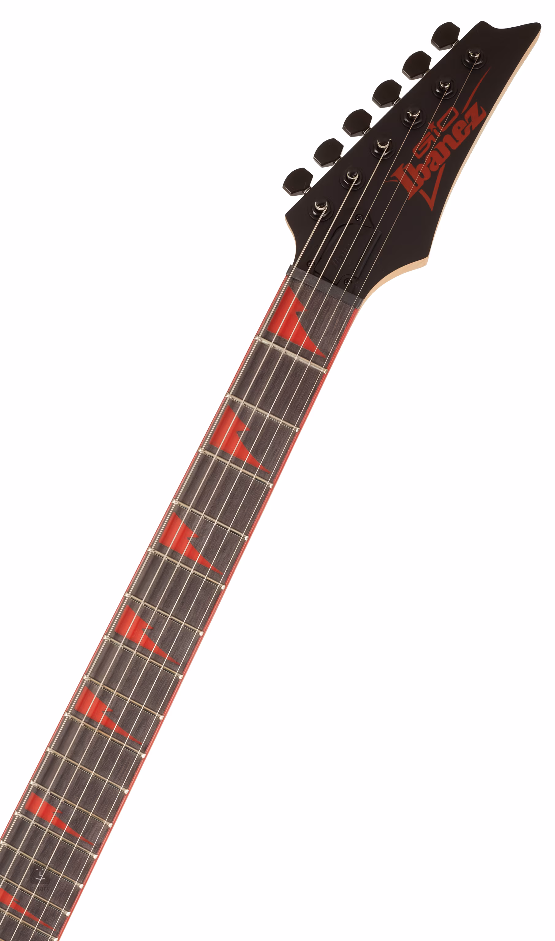 Der Korpus der Gitarre ist aus Pappelholz gefertigt. Ein Griffbrett aus Purpleheart-Holz mit vierundzwanzig Jumbo-Bünden ist auf den verschraubten Ahornhals geklebt. Die Orientierung wird durch markante rote Markierungen im Sharktooth-Design erleichtert.
