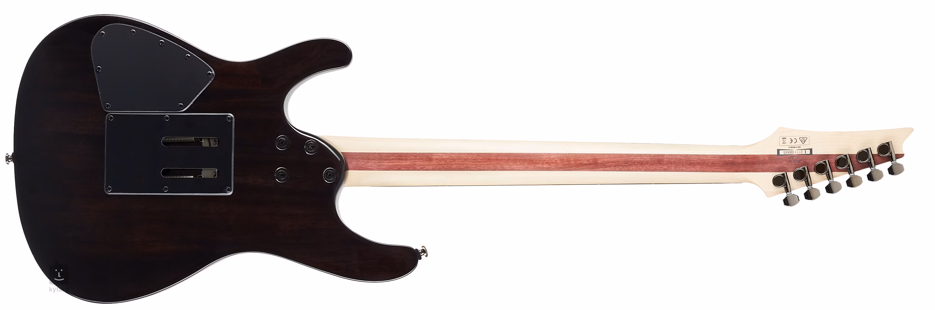 Der Mahagonikorpus des Instruments ist mit einer ausgefallenen Ahorndecke verziert. Ein Ebenholzgriffbrett mit vierundzwanzig Jumbo-Bünden ist auf einen verschraubten Hals aus drei Teilen Ahorn und Purpleheart geklebt. Ein Perlmuttmotiv (Beaten Path) mit hervorgehobenen Positionsmarkierungen/Impulsen verläuft über das Griffbrett. Nachleuchtende Markierungen an der Seite des Griffbretts erleichtern die Orientierung auf der Oberfläche des Griffbretts und in hinterleuchteten Bühnenumgebungen.