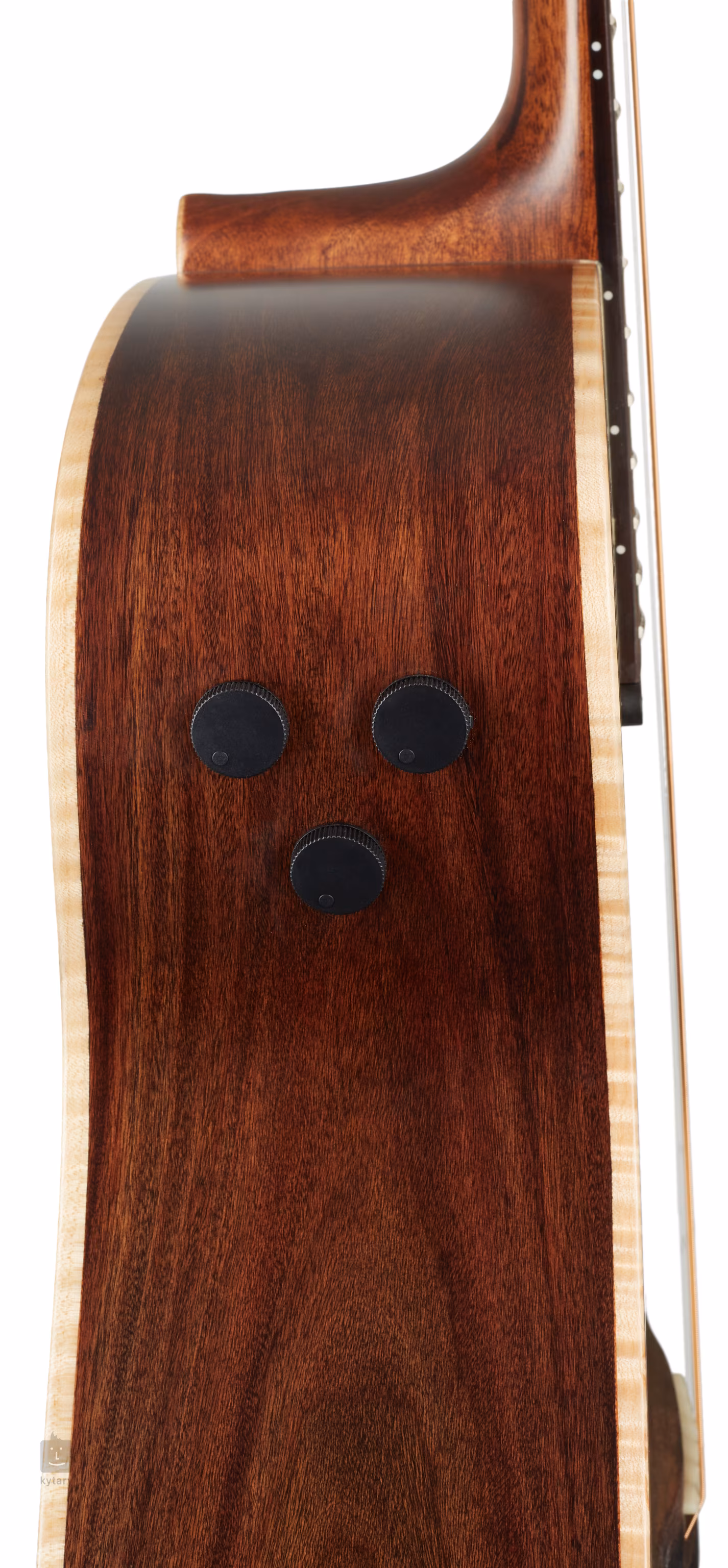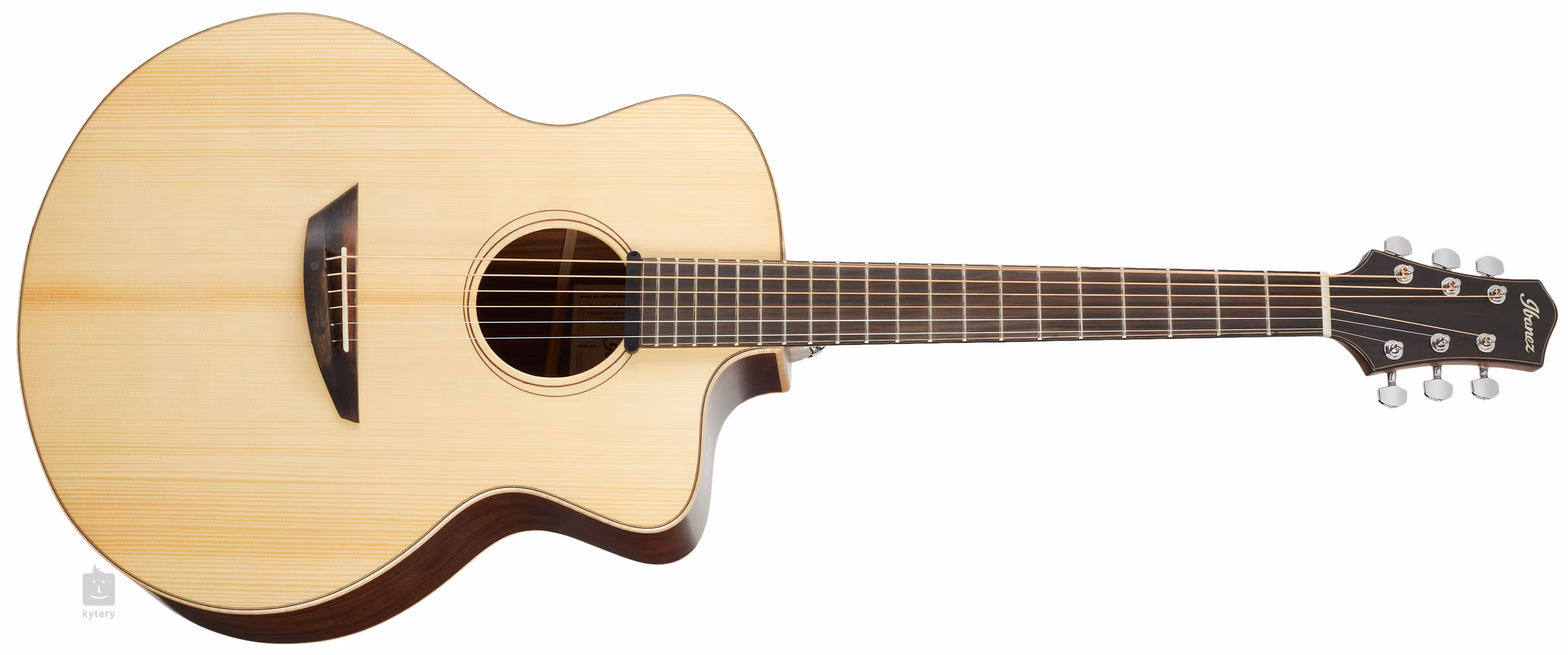 Für die originalgetreue Übertragung des akustischen Klangs und die Erfassung perkussiver Elemente sorgt eine Tonabnehmerkombination aus einem Ibanez AP11 Magnet-Tonabnehmer, einem subkubischen Piezo-Tonabnehmer und einem Kontakt-Tonabnehmer. Die Lautstärke der einzelnen Tonabnehmer kann mit den Reglern an der Kopfplatte der Gitarre eingestellt werden. Zwei Klinkenausgänge von der Gitarre bieten die Möglichkeit des Stereo- und Monoanschlusses (im Falle des Stereoanschlusses geht das Signal des magnetischen Tonabnehmers durch die Endpin-Buchse, das Signal des Piezo- und Kontakt-Tonabnehmers geht durch die zweite Buchse). Die Saiten sind über den Nullbund und den kompensierten Knochensattel in verchromten Die-Cast-Werken mit 18:1-Übersetzung und Ebenholzgriffbrett verankert. Die schöne Verarbeitung wird durch die Einfassung des Korpus aus gemasertem Ahorn und die Holzrosette unterstrichen.