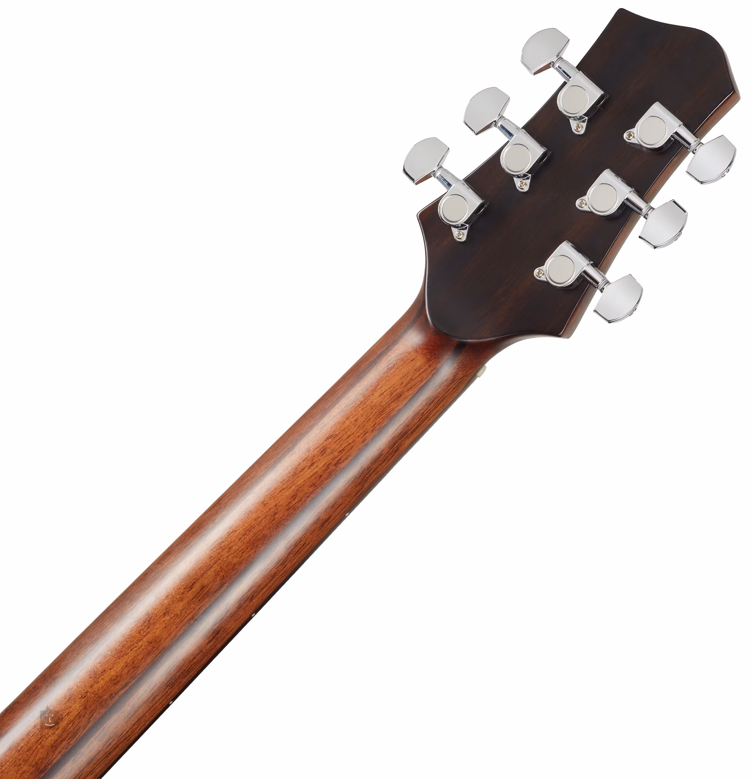 Die Frontplatte der PA300E-NSL besteht aus massiver deutscher Fichte, während die Bodenplatte und die Zargen aus überzogenem Pau Ferro gefertigt sind. Auf den fünfteiligen Hals aus afrikanischem Mahagoni und Pau Ferro ist ein Makasar-Griffbrett aus Ebenholz geklebt, das mit zwanzig Jumbo-Bünden ausgestattet ist. Die gute Resonanz des Instruments wird durch eine modifizierte X-M-Rippung unterstützt, die die Saitenschwingungen optimal auf den Korpus überträgt.