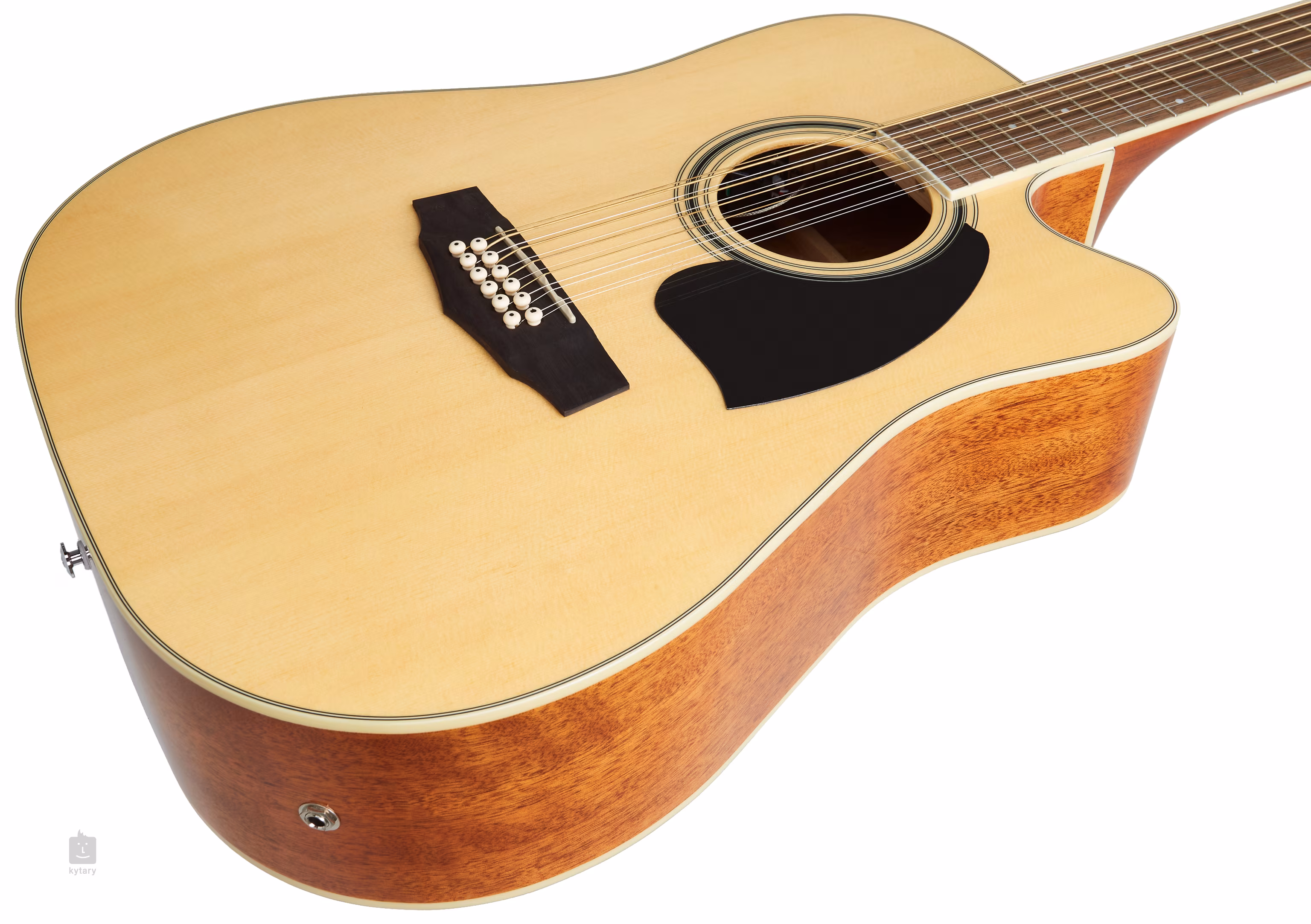 Der laminierte Korpus der 12-saitigen Dreadnought PF1512ECE-NT besteht aus Fichtenfront und Okoumé-Boden und -Zargen. Auf den Hals aus exotischem Nyatoh-Holz ist ein Feigengriffbrett mit zwanzig Bünden geklebt. Weiße Positionspunkte erleichtern das Navigieren auf dem Griffbrett.