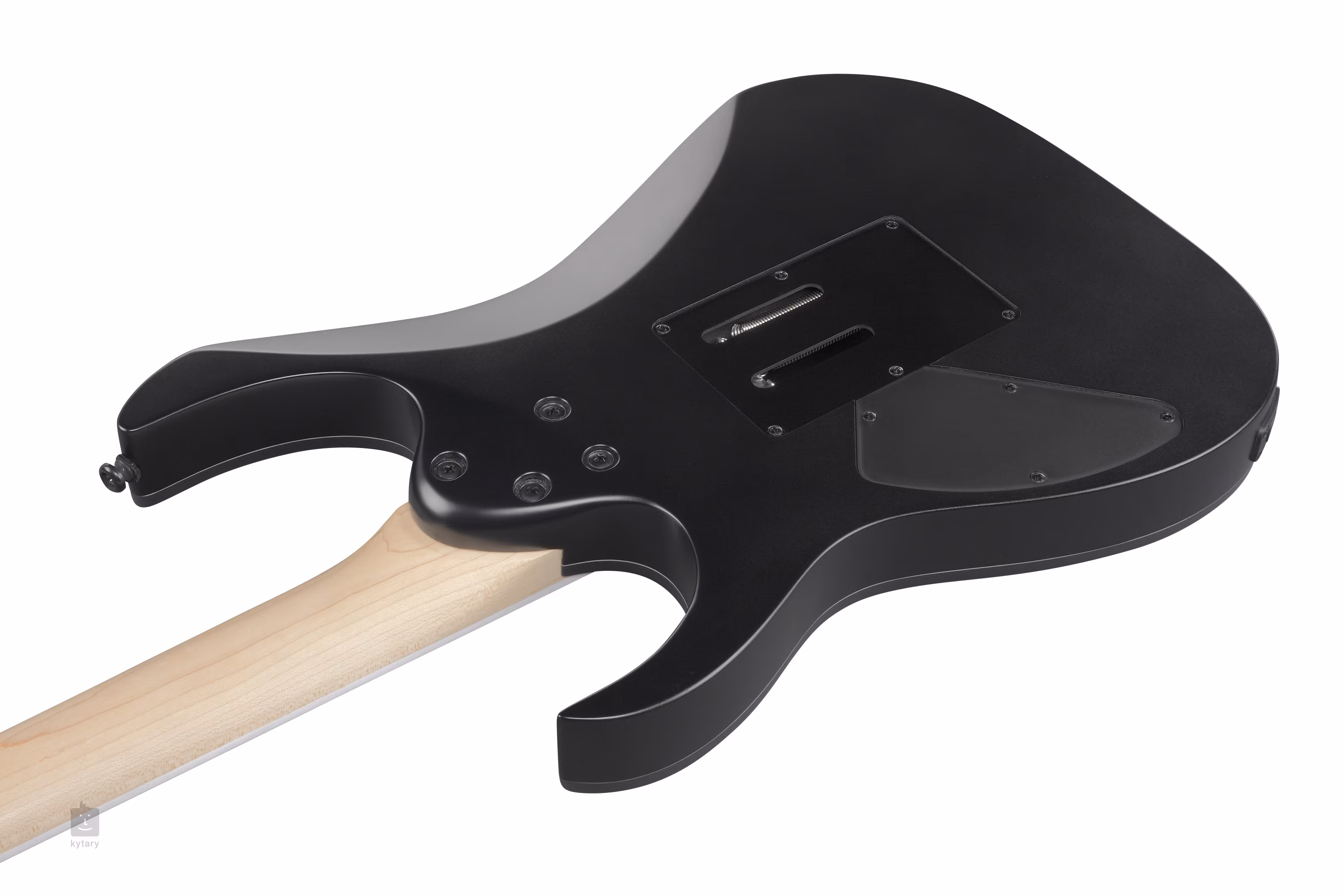 Der Korpus der RG420EX-BKF ist aus Meranti gefertigt. Der schnelle Ahornhals mit Wizard-III-Profil ist auf ein Jatoba-Griffbrett geklebt, das mit vierundzwanzig Jumbo-Bünden bestückt ist. Weiße Positionspunkte auf dem Griffbrett erleichtern die Orientierung.