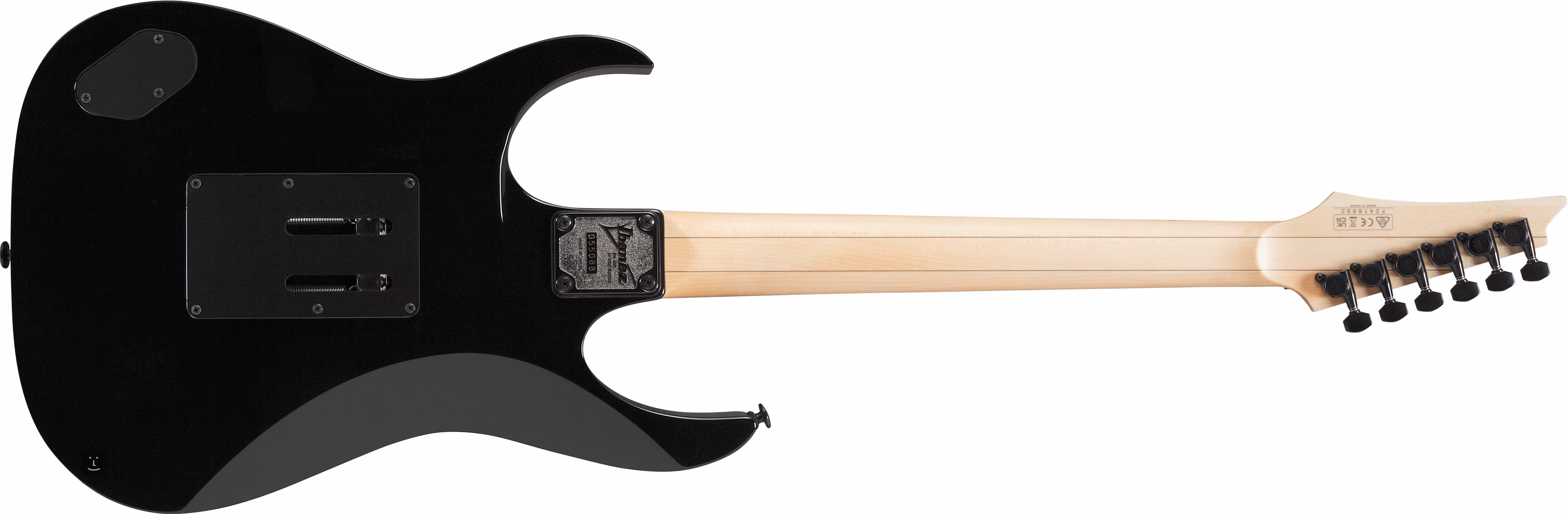 Der Korpus der RG550 BLK E-Gitarre ist aus Linde gefertigt. Ein fünfteiliger Hals aus Ahorn und Walnuss ist auf ein Ahorn-Griffbrett mit vierundzwanzig Jumbo-Bünden geleimt. Das flache Profil des Super Wizard HP Halses ist ideal für schnelles Shredden. Die Orientierung auf dem Griffbrett wird durch schwarze Positionspunkte erleichtert.