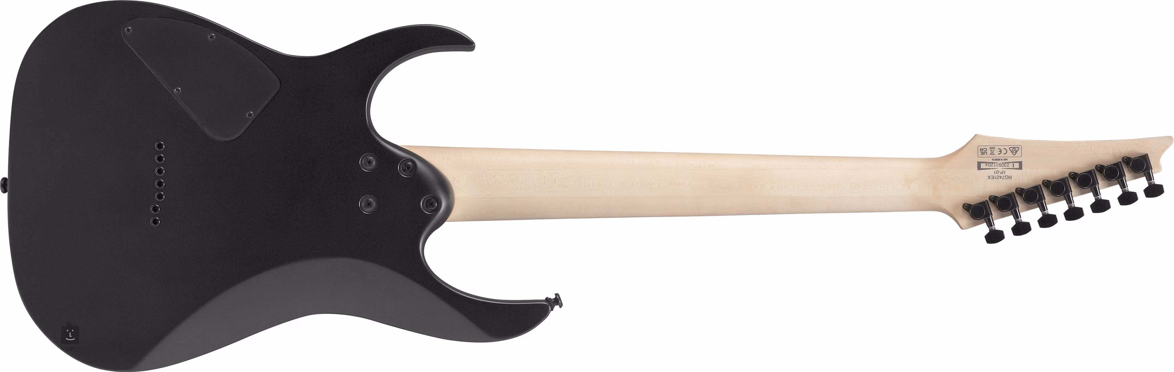 Der Korpus der siebensaitigen RG7421EX-BKF-Gitarre ist aus Meranti gefertigt. Der schnelle Ahornhals mit Wizard II-7-Profil ist auf ein Jatoba-Griffbrett mit vierundzwanzig Jumbo-Bünden geleimt. Positionspunkte auf dem Griffbrett erleichtern die Orientierung.