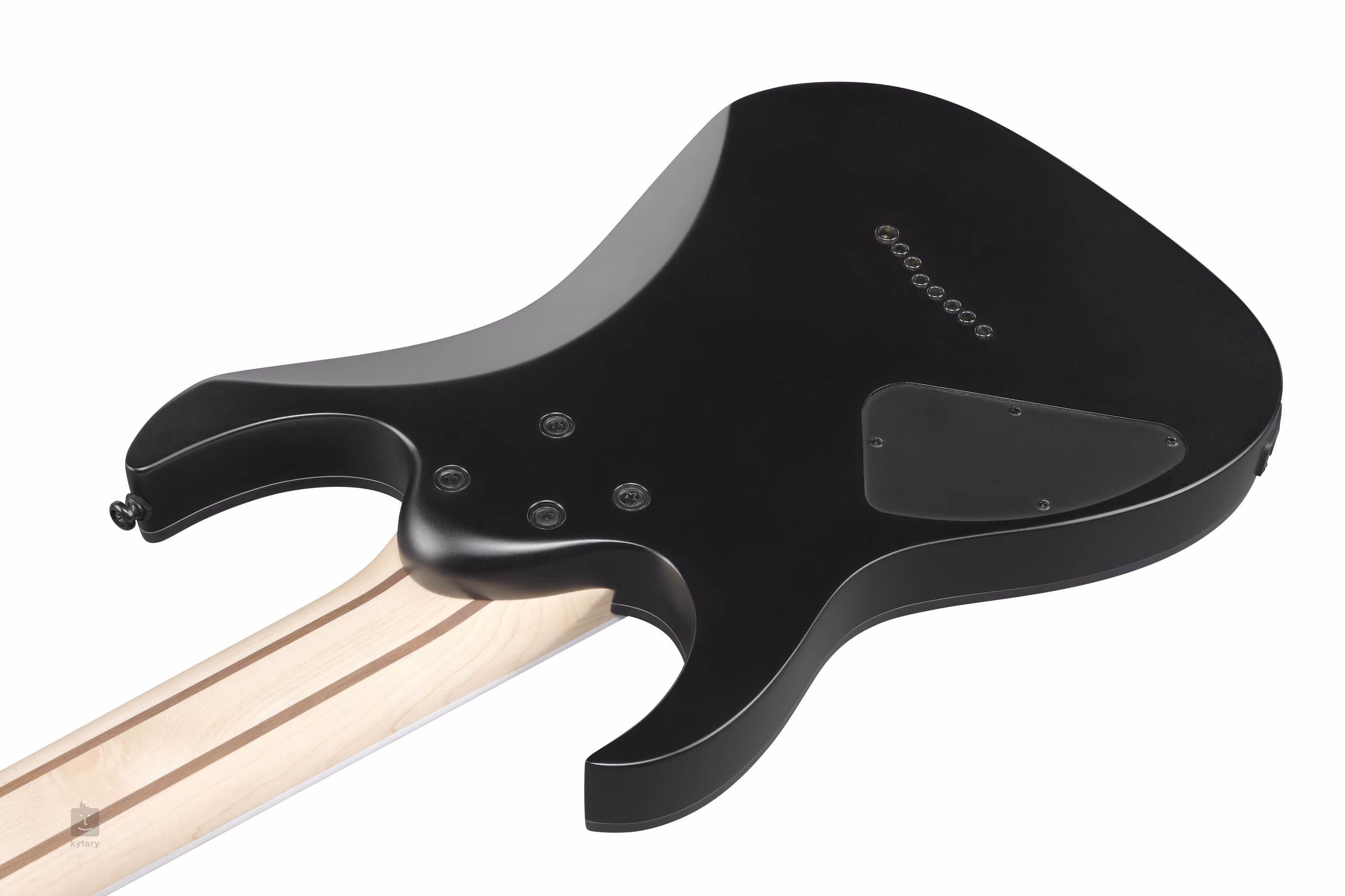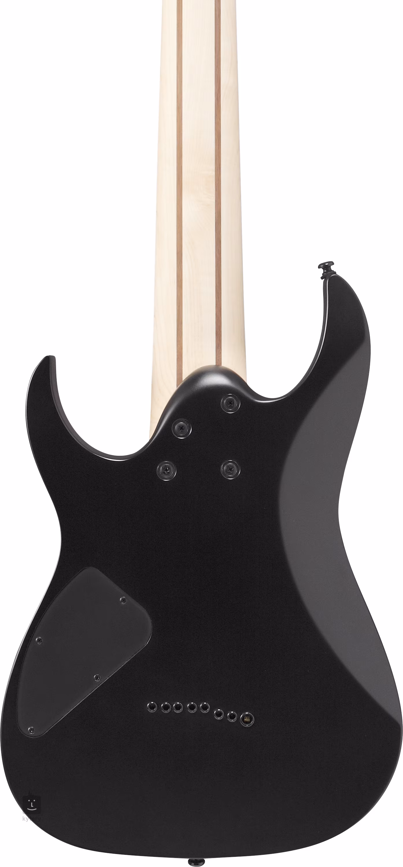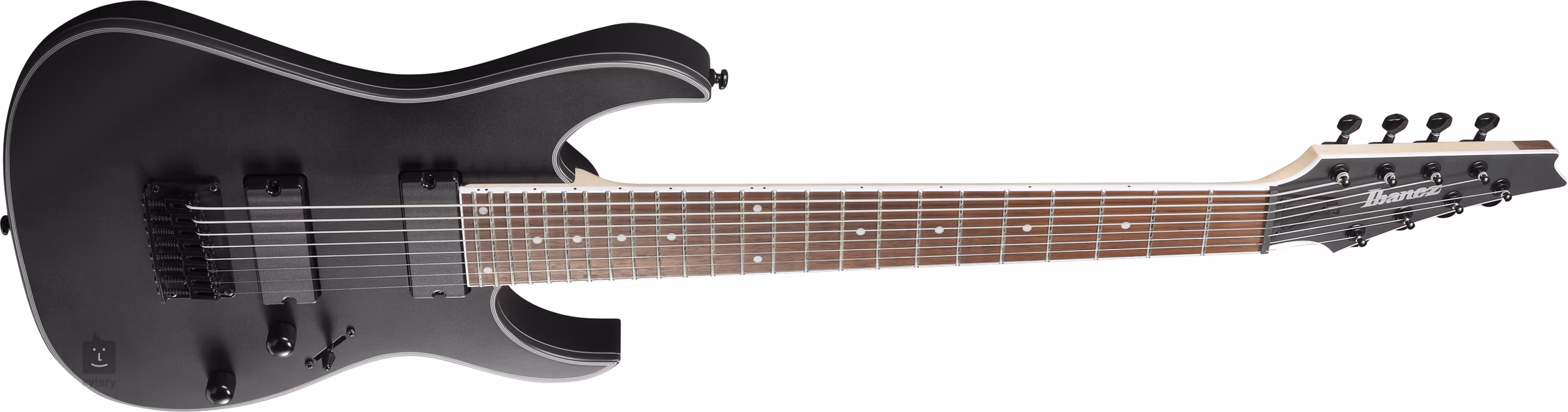 Der Korpus der achtsaitigen RG8EX-BKF ist aus Meranti gefertigt. Ein fünfteiliger Hals aus Ahorn und Walnuss mit einem schnellen Wizard II-8-Profil ist auf ein Jatoba-Griffbrett mit vierundzwanzig Jumbo-Bünden geleimt. Eine längere Bariton-Menorah (686 mm) hilft bei der Artikulation des "Fat Wire Eight"-Sounds der Gitarre. Die Orientierung auf dem Griffbrett wird durch Positionspunkte erleichtert.