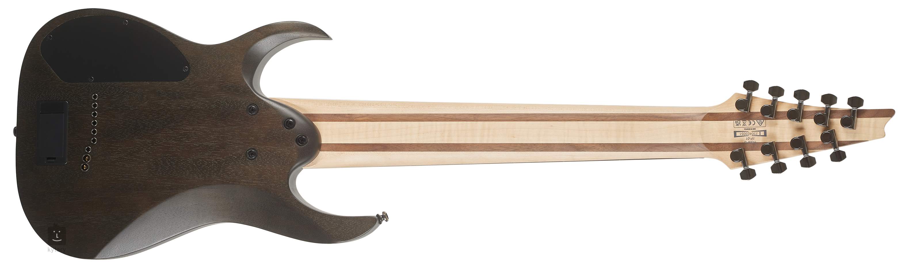 Der Korpus der neunsaitigen RG9PB-TGF-Gitarre ist aus massivem Nyatoh-Holz und Pappel-Maser-Deckenfurnier gefertigt. Ein fünfteiliger Hals aus Ahorn und Walnuss mit einem Wizard-9-Profil ist mit einem Makassar-Ebenholz-Griffbrett verschraubt, das mit vierundzwanzig Jumbo-Bünden ausgestattet ist. Neun Saiten sind auf die längere Mensur (712 mm) des Instruments abgestimmt.