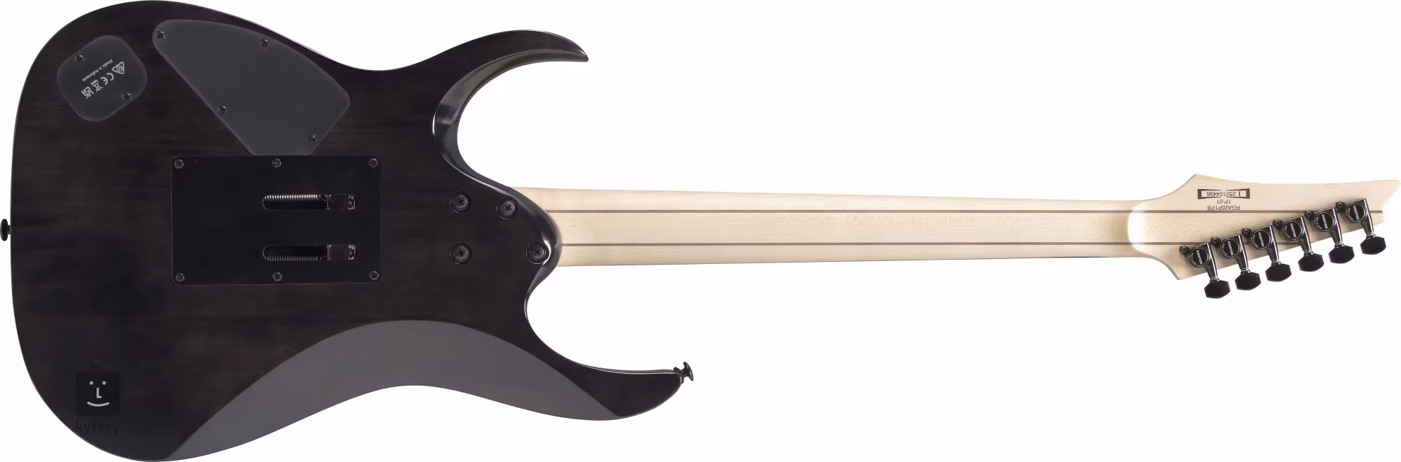 Der limonenfarbene Korpus der RGA20P1PB Cosmic Blue Burst E-Gitarre ist mit einem spektakulären Pappel-Maser-Deckenfurnier und einem Holzmosaik aus Ahorn, Walnuss und Panga Panga verziert. Ein Ebenholz-Griffbrett mit vierundzwanzig Jumbo-Bünden aus rostfreiem Stahl ist auf einen verschraubten, schmalen, fünfteiligen Hals aus Ahorn und Walnuss geklebt. Abgerundete Bundkanten (Premium-Bundkantenbehandlung), Leuchtpunkte an der Seite des Griffbretts und Perlmutt-Positionspunkte sorgen für mehr Spielkomfort.