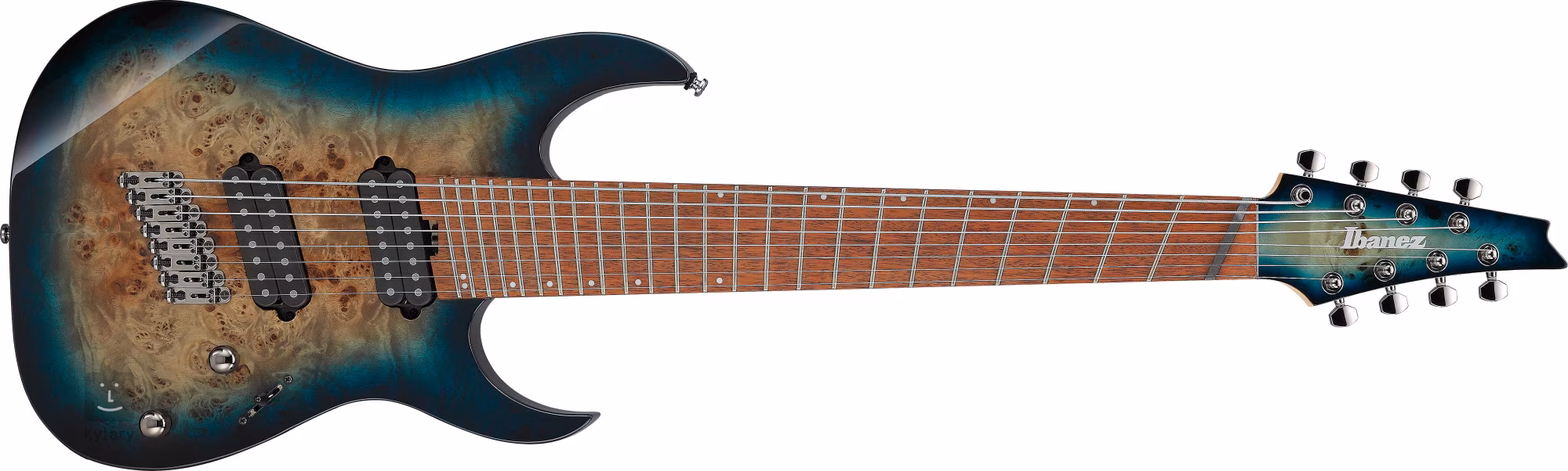 Der Nyatoh-Korpus der achtsaitigen RGMS8PB Cosmic Blue Starburst-Gitarre ist mit einer Pappel-Maserdecke furniert und mit Cosmic Blue Starburst lackiert. Ein fünfteiliger Hals aus Ahorn und Walnuss ist mit einem Jatoba-Griffbrett verschraubt, das mit vierundzwanzig Jumbo-Bünden ausgestattet ist. Das derzeit populäre Multi-Scale-Konzept, d.h. die Bestückung des Griffbretts mit diagonal angeordneten Bünden, verleiht dem Instrument eine variable Mensur (692 - 648 mm) und optimale Spannung. Nach Meinung einiger Musiker ermöglicht es auch eine natürlichere Bewegung der Hand auf dem Griffbrett. Die Orientierung auf dem Griffbrett wird durch versetzte Positionspunkte erleichtert.