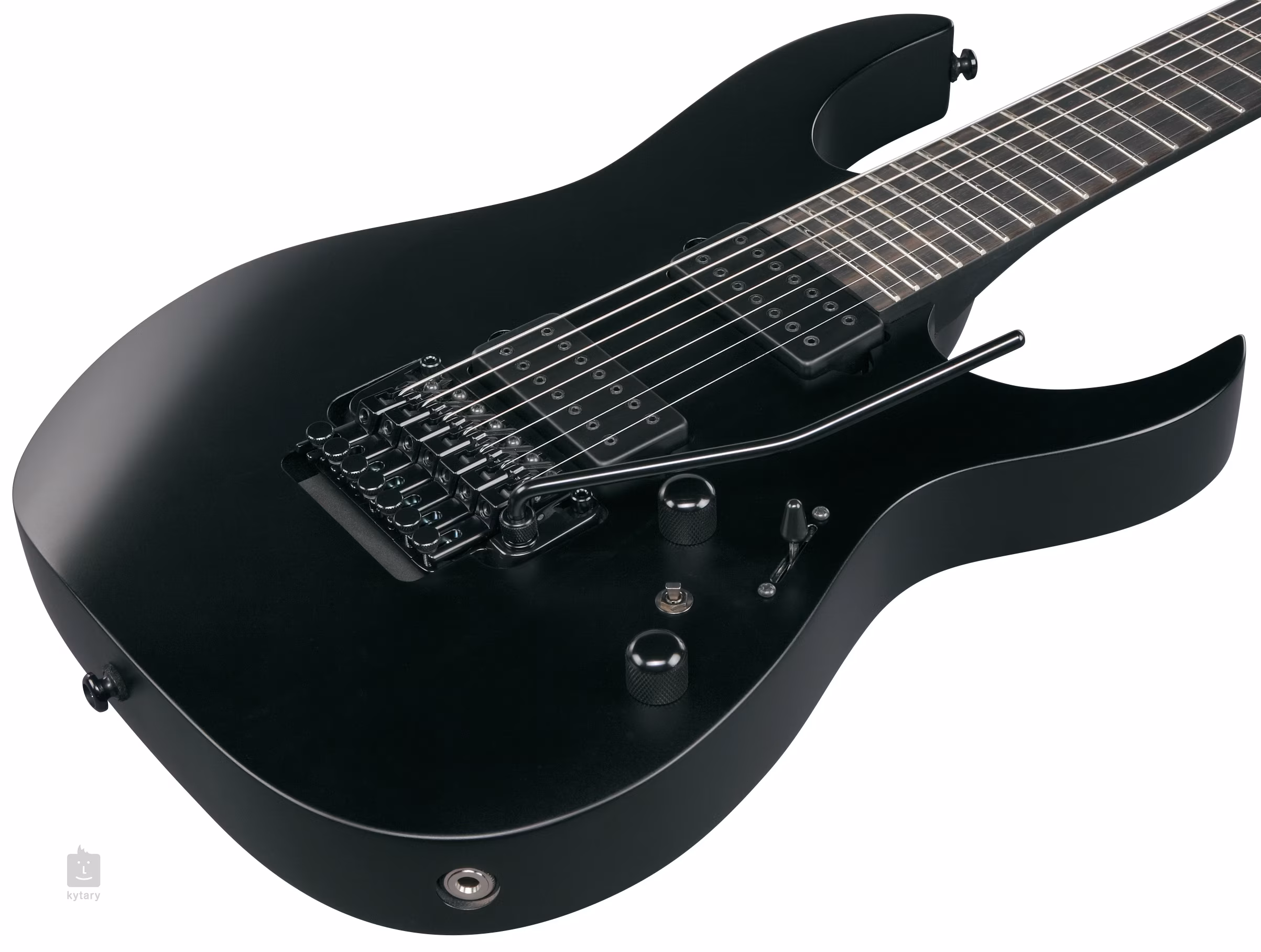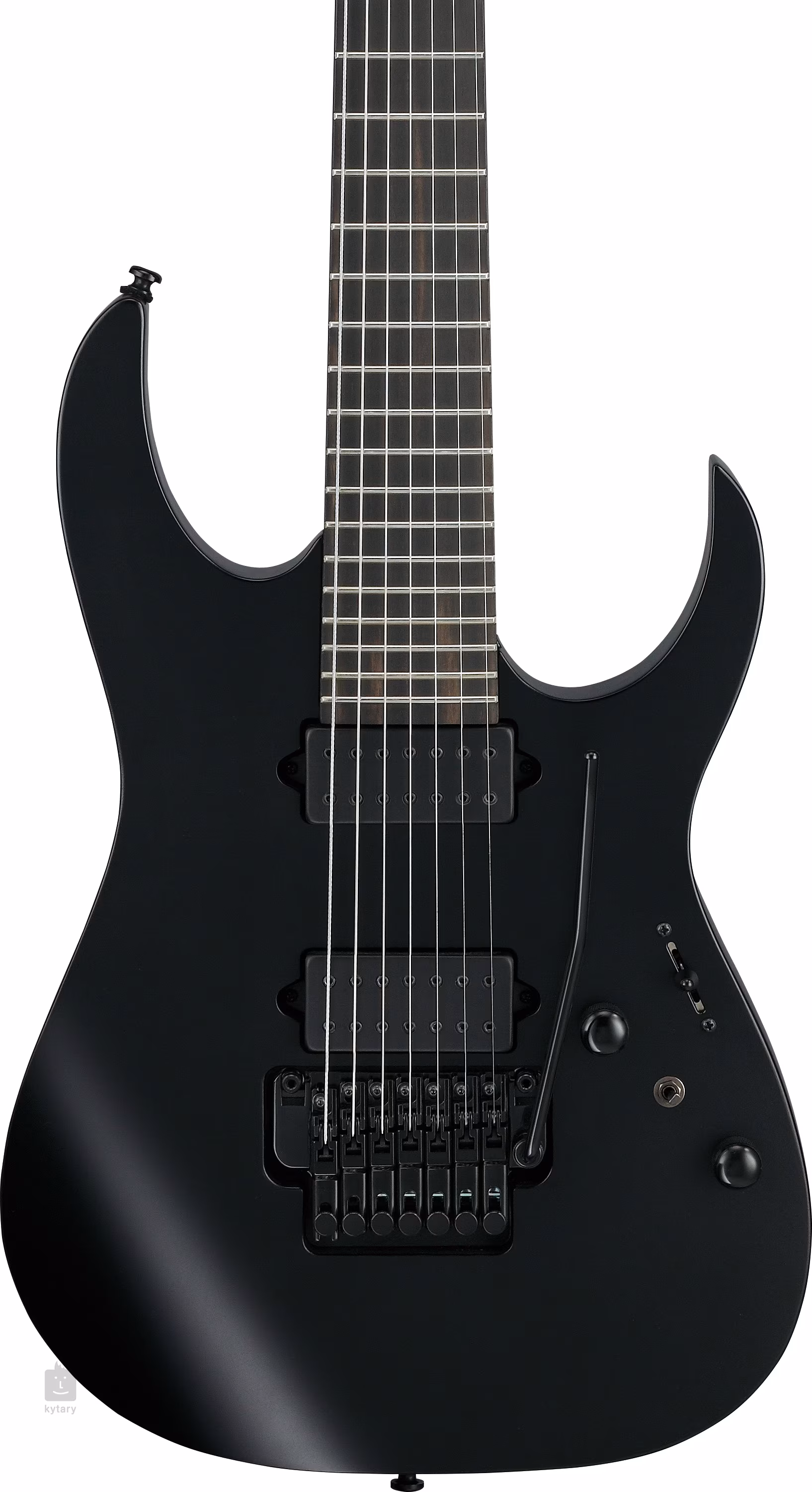 Der Korpus der siebensaitigen Iron Label RGRB720-BKF Gitarre im RG Super ST Design ist aus Nyatoh-Holz gefertigt. Ein dreiteiliger Ahornhals mit einem schnellen Wizard II-7-Profil ist mit einem Ebenholz-Griffbrett verschraubt, das mit vierundzwanzig Jumbo-Bünden ausgestattet ist. Nachleuchtende Seitenpunkte helfen Ihnen, sich auch in der Dämmerung auf dem Griffbrett zurechtzufinden.
