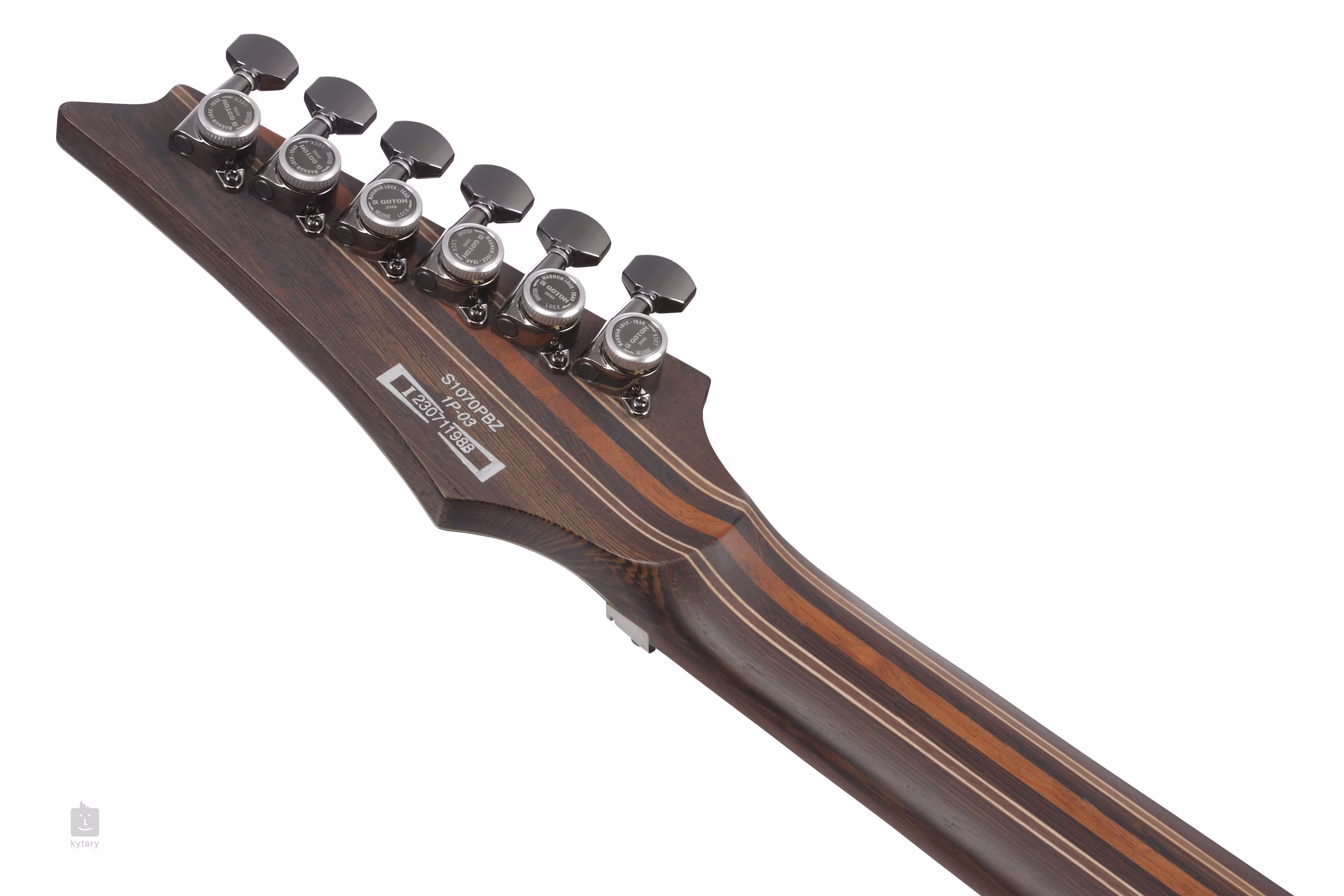 Der Mahagoni-Korpus der S1070PBZ-CKB verfügt über eine spektakuläre Pappel-Maserdecke und Streifen aus Ahorn, Walnuss und Panga Panga. Der Hals, der aus elf Stücken Panga Panga, Ahorn, Walnuss und Bubinga besteht, bietet ein ähnliches Mosaik an Materialien. Das Palisander-Griffbrett ist durch vierundzwanzig Jumbo-Bünde aus rostfreiem Stahl und Positionspunkte aus Perlmutt unterteilt. Die abgerundeten Bundkanten (Premium-Bundkantenbehandlung) und die Leuchtpunkte an der Seite bieten mehr Spielkomfort.