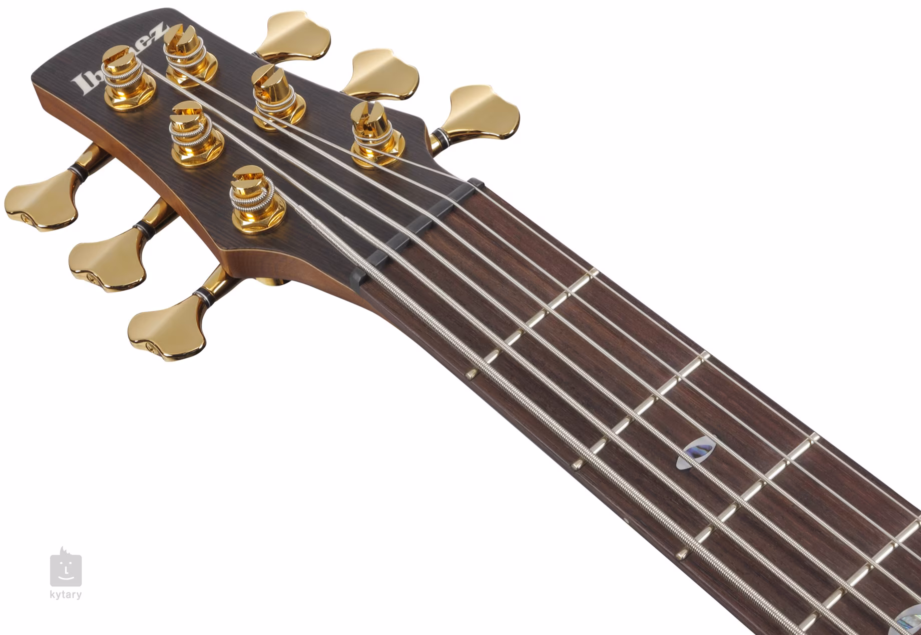 Der Mahagoni-Korpus des sechssaitigen Ibanez SR5506 Mocha E-Basses aus der höherwertigen Prestige-Serie der Japaner ist mit einer Ovangkol-Decke mit markantem Muster versehen. Ein Palisander-Griffbrett aus fünf Stücken geröstetem Ahorn und Walnuss ist auf den schnellen Hals geleimt, der mit vierundzwanzig mittelgroßen Bünden mit Prestige-Bundkantenbehandlung ausgestattet ist. Der Hals des Basses wurde vor dem Zusammenbau dem patentierten S-Tech-Verfahren zur Wärmebehandlung unterzogen, das seine Eigenschaften (Stabilität, Haltbarkeit, Beständigkeit gegen Wasser und Temperaturschwankungen) verbessert und dem Instrument gleichzeitig einen angenehmen Vintage-Touch verleiht. Die Orientierung auf dem Griffbrett wird durch dekorative ovale Perlmuttmarkierungen (Abalone, Perlmutt) erleichtert.