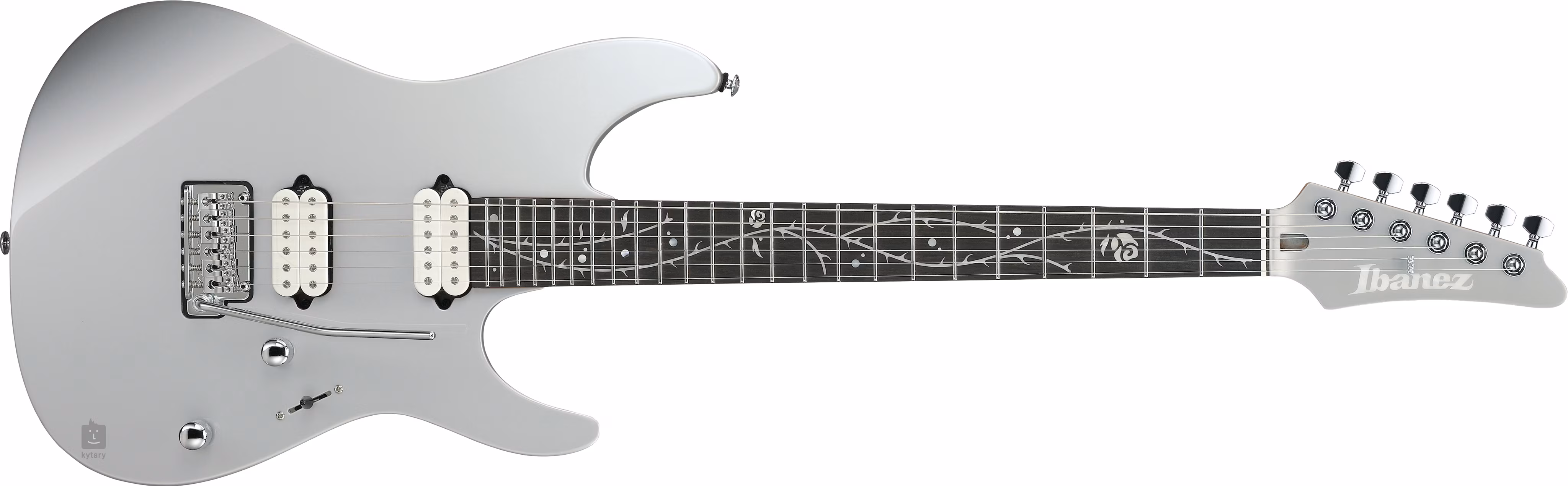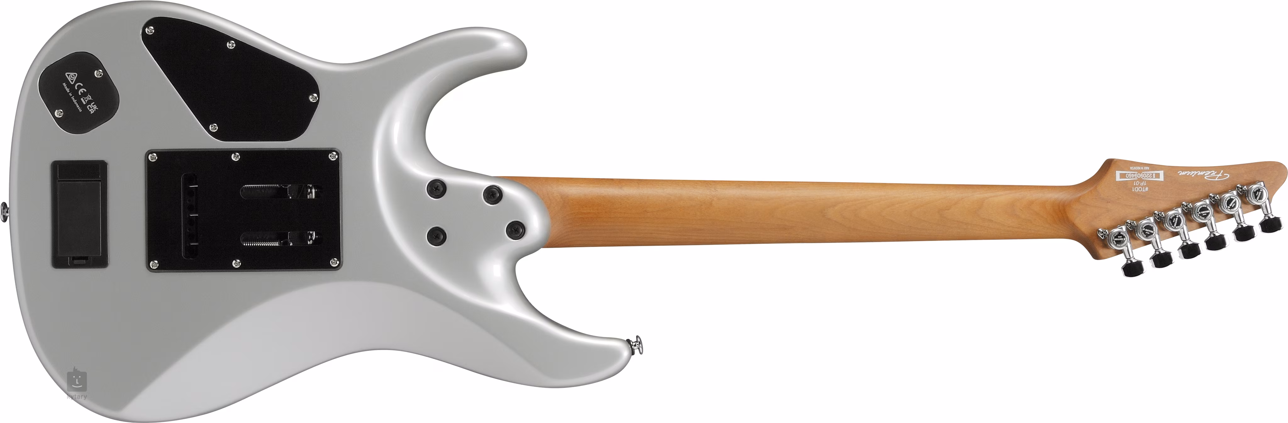 Die Saiten werden in Gotoh MG-T Locking-Mechaniken gehalten und das Gotoh T1502 Tremolo hat Stahlsättel und einen Tremoloblock aus Zinkdruckguss. Das stilvolle Aussehen der Gitarre wird durch die silberne Lackierung und verchromte Hardware unterstrichen.