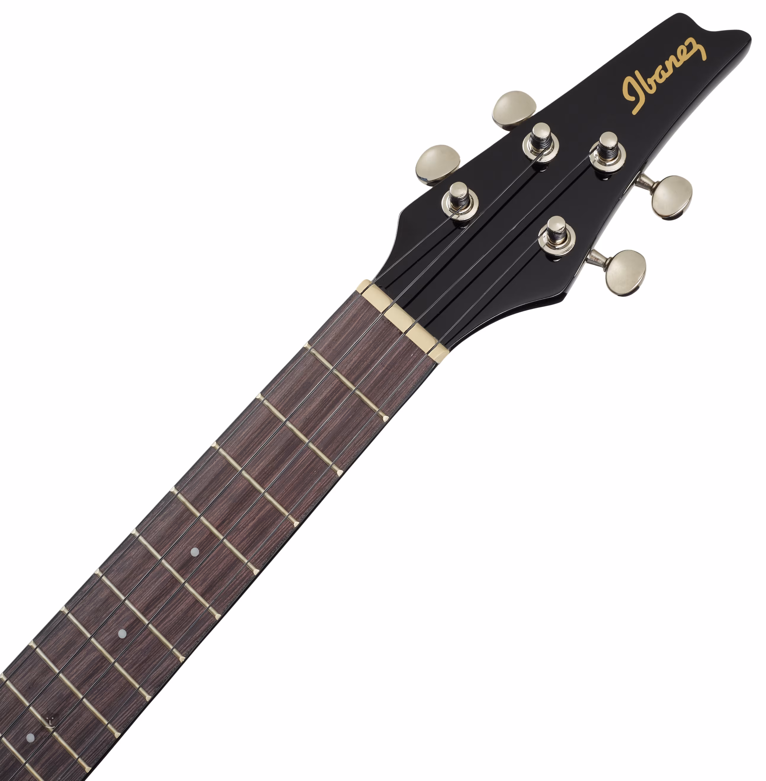 Die elektroakustische Ukulele Ibanez UICT10-BK im Tenorformat ist eine verkleinerte viersaitige Adaption der berühmten Ibanez Iceman E-Gitarre.