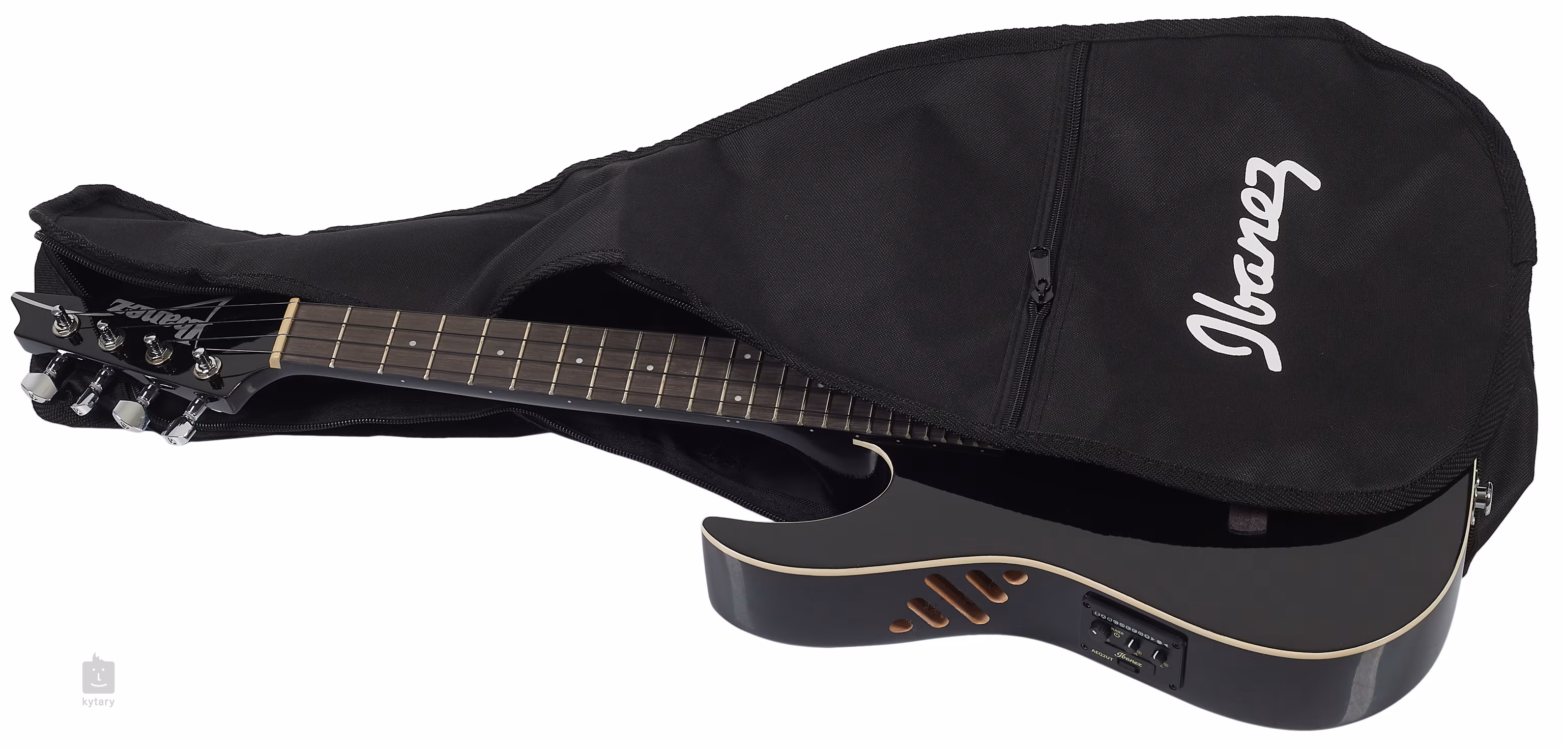 Die elektroakustische Ukulele URGT100-BK von Ibanez im Tenorformat ist eine verkleinerte viersaitige Adaption der beliebten Super ST-E-Gitarren von Ibanez.