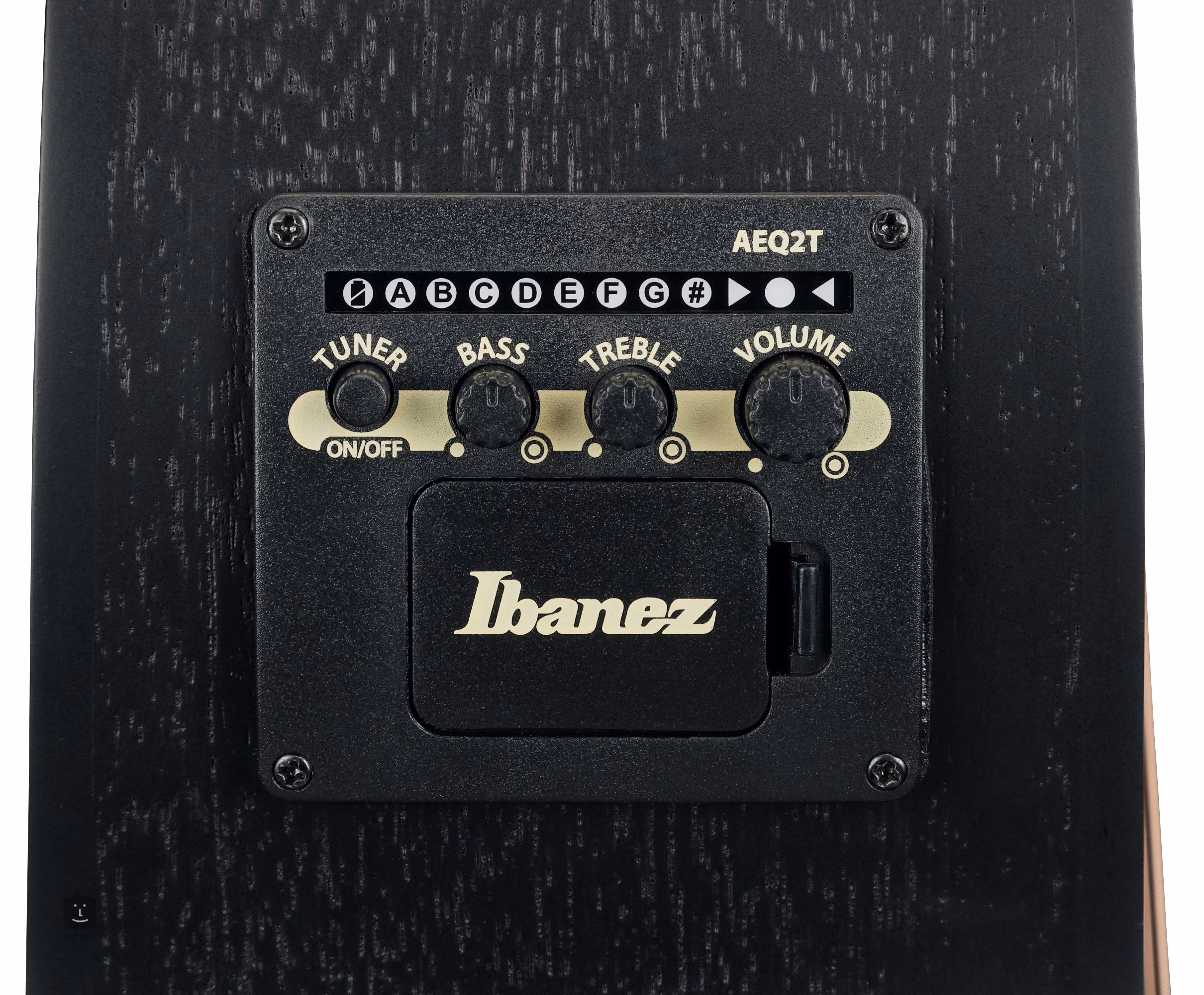 Für die Intonation des Instruments sorgen ein subkubischer Piezo-Tonabnehmer und ein Ibanez AEQ-2T Vorverstärker mit Zweiband-Equalizer und eingebautem Stimmgerät. Die Saiten sind in verchromten Stimmmechaniken und einem Griffbrett aus Nandu-Holz gelagert. Die Ibanez Advantage-Wirbel bieten gegenüber den Standardmodellen den Vorteil einer einfachen Handhabung und eines soliden Saitensitzes. Das stilvolle Finish wird durch die Weathered Black Open Pore Farblackierung und das schwarze Schlagbrett akzentuiert.