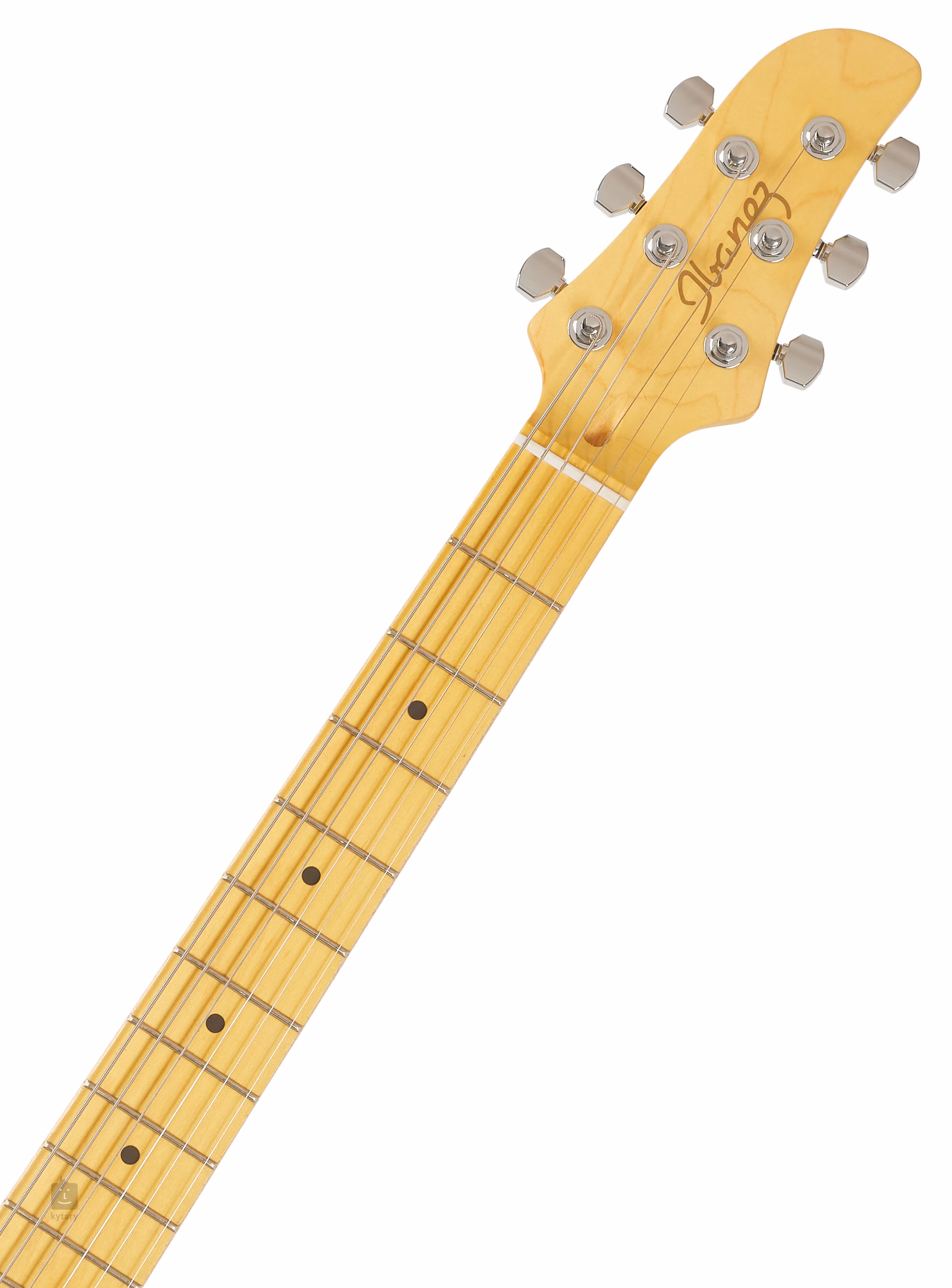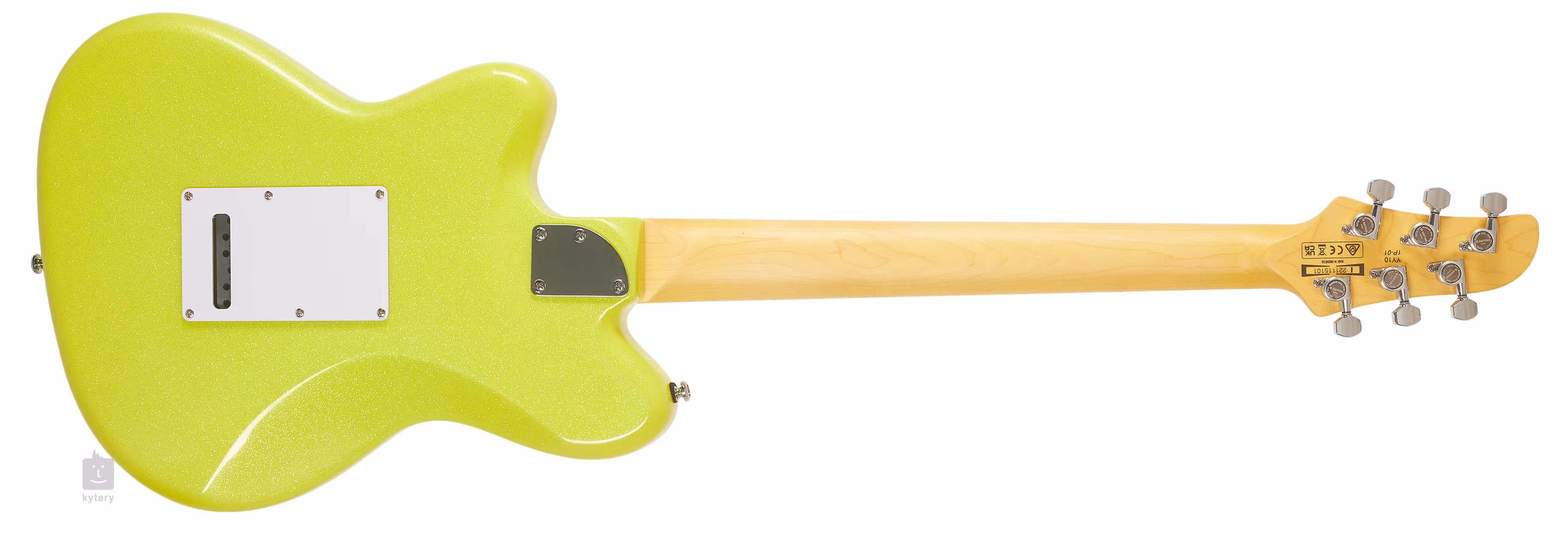 Ein Satz von drei Seymour Duncan Five-Two Single-Coil-Tonabnehmern (mit Alnico V und II Magneten) verleiht der Gitarre einen klaren, dynamischen Sound mit perfekter Ton/Akkord-Artikulation. Der Klangcharakter lässt sich serienmäßig mit den Potentiometern für Lautstärke und Klangfarbe sowie dem fünfstufigen Tonabnehmerschalter einstellen. Stimmstabilität und schnelle Saitenwechsel werden durch die Verankerung der Saiten in Gotoh Locking-Mechaniken gewährleistet, während auf der anderen Seite die Saiten in einem synchronisierten Wilkinson WV6-SB Tremolo gehalten werden. Der stilvolle Look der Gitarre wird durch die Korpusfarbe Slime Green Sparkle und die verchromte Hardware noch unterstrichen.