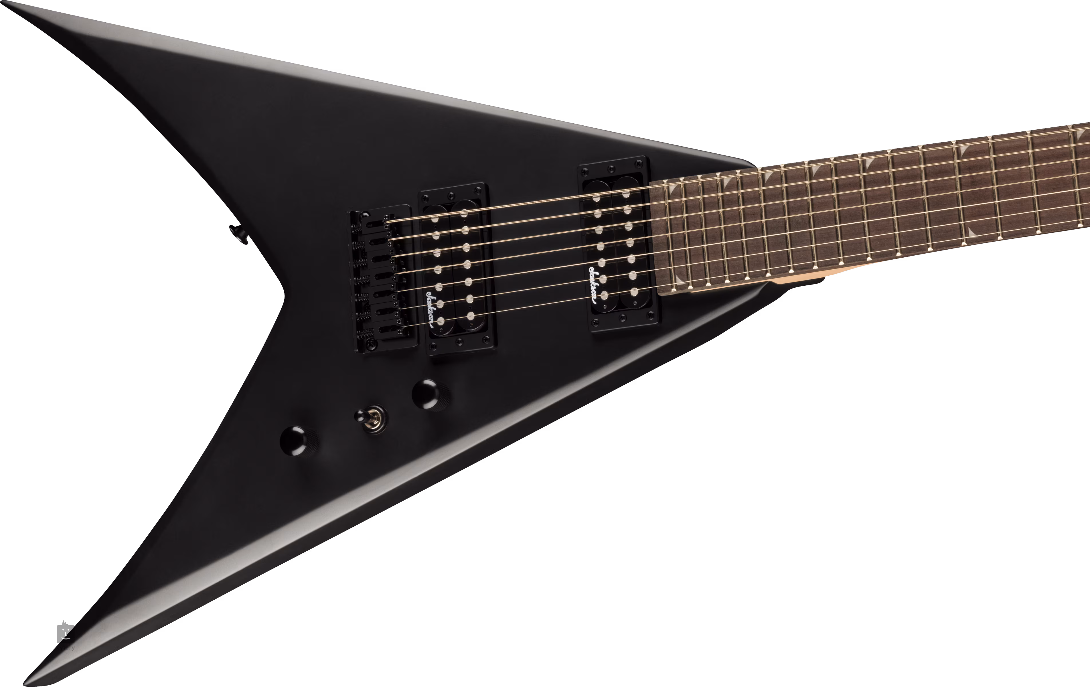 Der Korpus der siebensaitigen Gitarre JS22-7 KV- SATIN BLACK ist aus Pappelholz gefertigt. Der geschraubte Ahornhals mit Graphitbeleistung ist auf ein Amaranth-Griffbrett (Purpleheart) mit vierundzwanzig Jumbo-Bünden geklebt. Sein Radius flacht zum Korpus hin ab - das ermöglicht sowohl bequemes Riffing am Nullbund als auch komfortables, ultraschnelles Shredden in höheren Lagen. Die längere Mensur der Gitarre (673 mm) hilft bei der Artikulation des Klangs auf dicken Saiten und bei der Spannung der Saiten. Positionsmarkierungen aus Perlmutt-Imitat erleichtern die Orientierung auf dem Griffbrett.