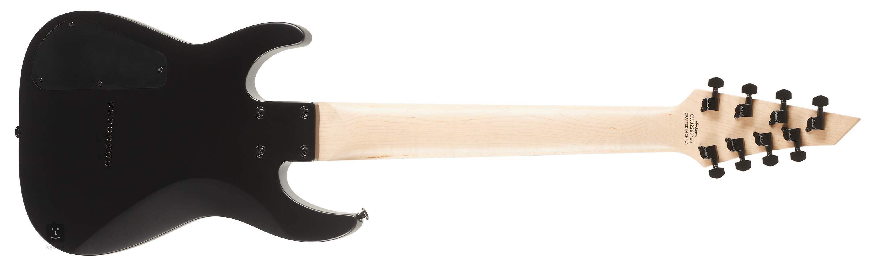 Der ergonomische Korpus dieser achtsaitigen Gitarre mit gewölbter Decke ist aus Pappelholz gefertigt. Ein einteiliger Ahornhals mit Graphitverstrebungen ist mit einem einteiligen Amaranth-Griffbrett (Purpleheart) verschraubt, das einen kombinierten Radius (12-16") und eine längere Mensur (673 mm) aufweist und mit vierundzwanzig Jumbo-Bünden ausgestattet ist. Positionsmarkierungen aus Perlmuttimitat vom Typ Piranha Tooth (Kleine Haifischflosse) erleichtern die Orientierung auf der Oberfläche.
