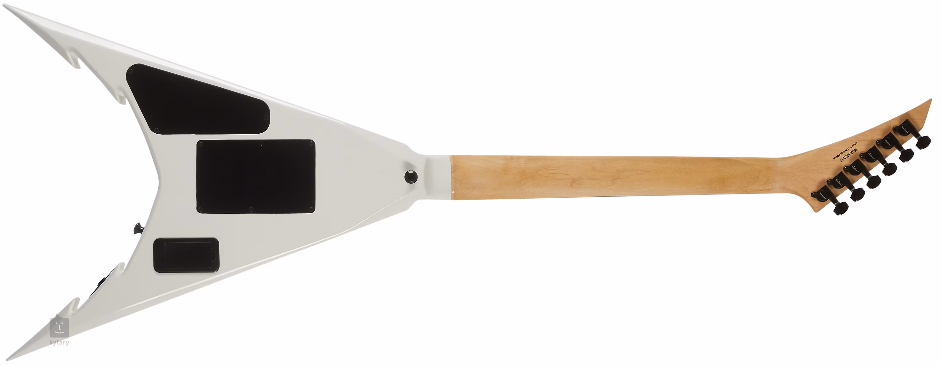 In diesem Fall handelt es sich um das Signature-Modell des Gitarristen der amerikanischen Metal-Band Trivium (Corey Beaulieu), das mit seinem modifizierten King V-Design und dem Winterstorm-Body-Finish sofort ins Auge sticht. Die Konstruktion der Gitarre besteht aus einem Mahagoni-Korpus, einem geflammten Ahorn-Deckenfurnier und einem durchgefrästen Ahorn-Hals mit Graphit-Beleistung. Diese Konstruktion wirkt sich positiv auf das Sustain des Instruments aus. Das Ebenholz-Griffbrett ist mit vierundzwanzig Jumbo-Bünden ausgestattet. Der Radius flacht zum Korpus hin ab - das ermöglicht sowohl komfortables Riffspiel am Nullbund als auch bequemes, ultraschnelles Shredden in höheren Lagen. Positionsmarker aus sharkfin-Perlenimitat erleichtern die Navigation auf dem Griffbrett.